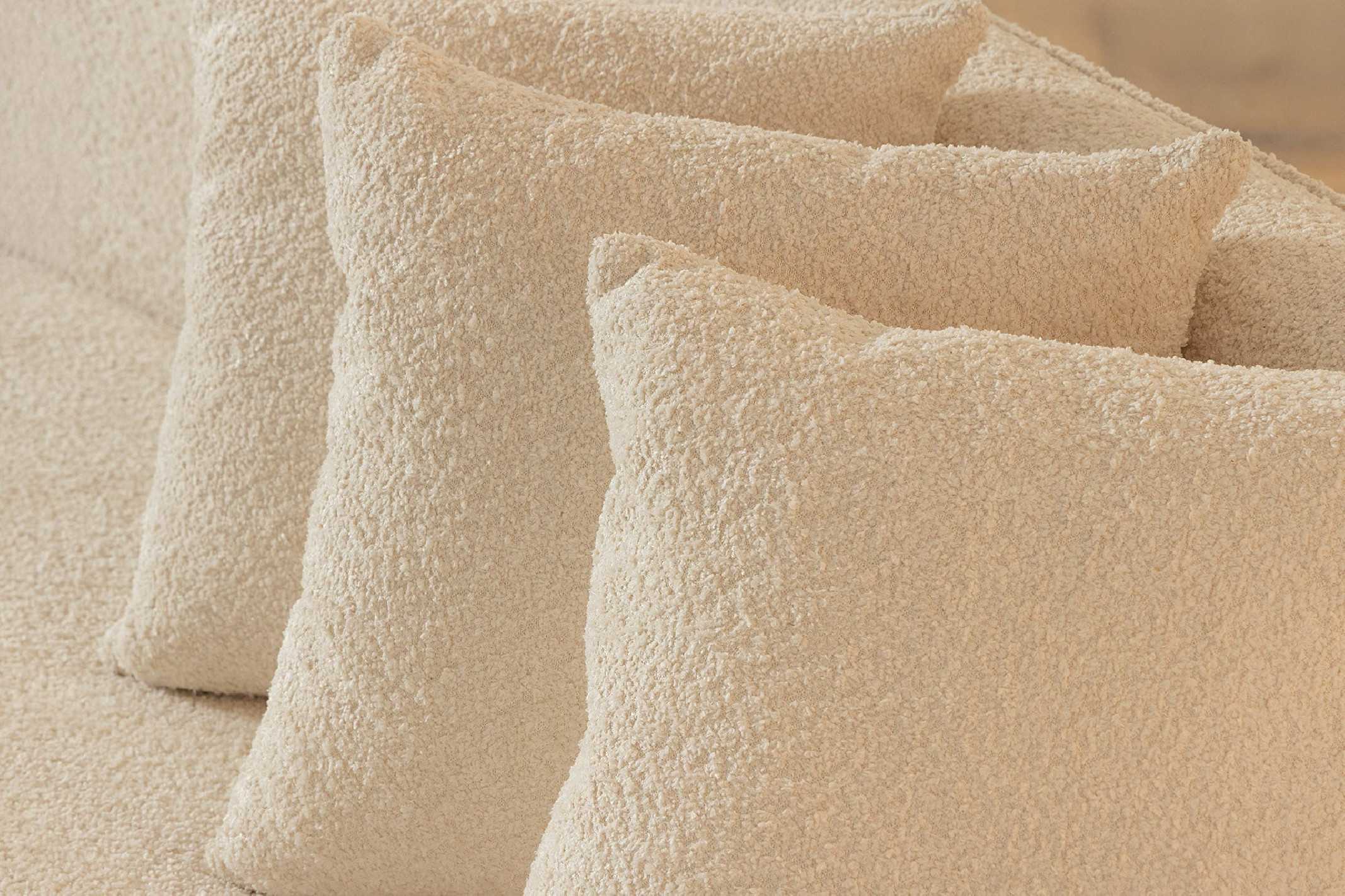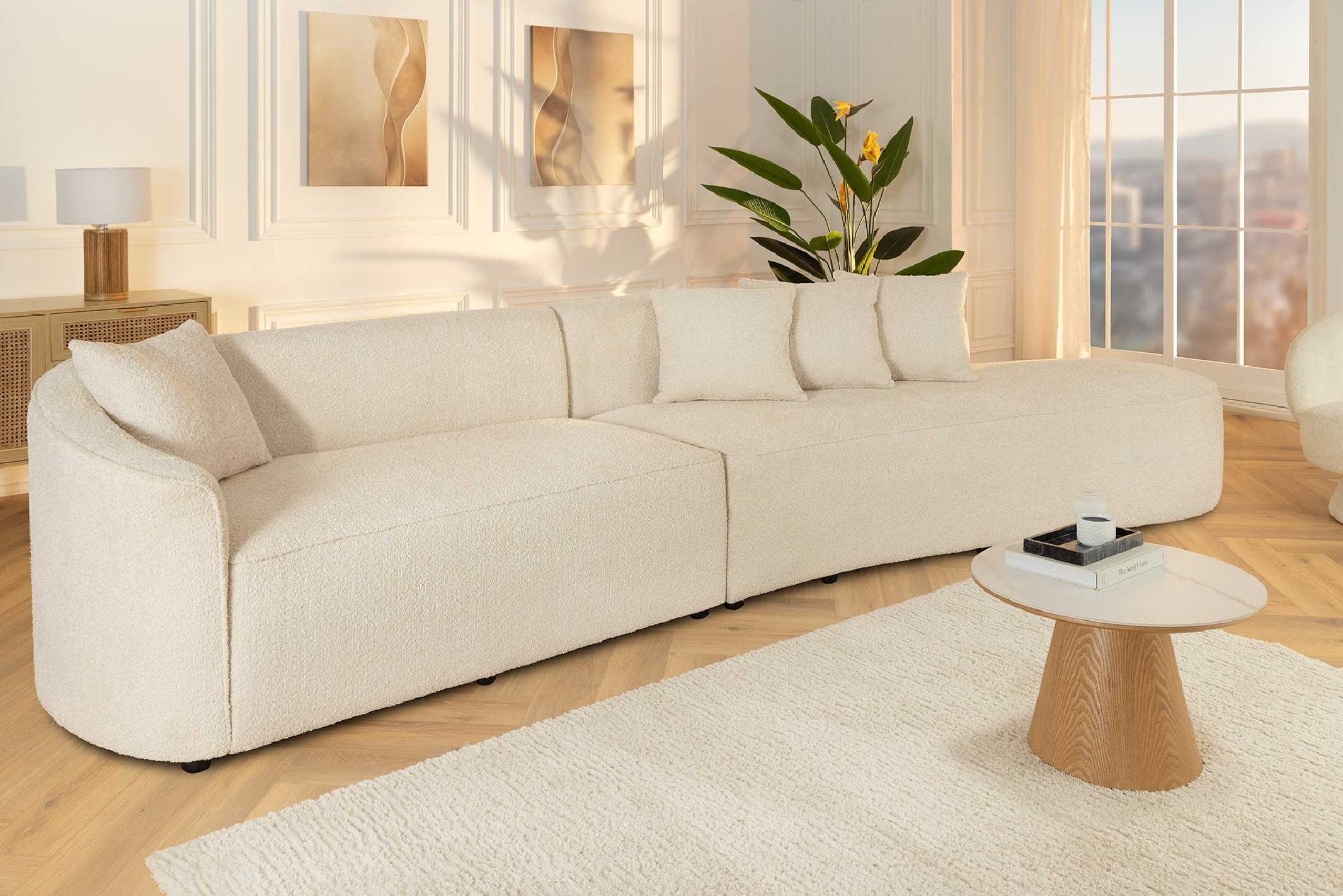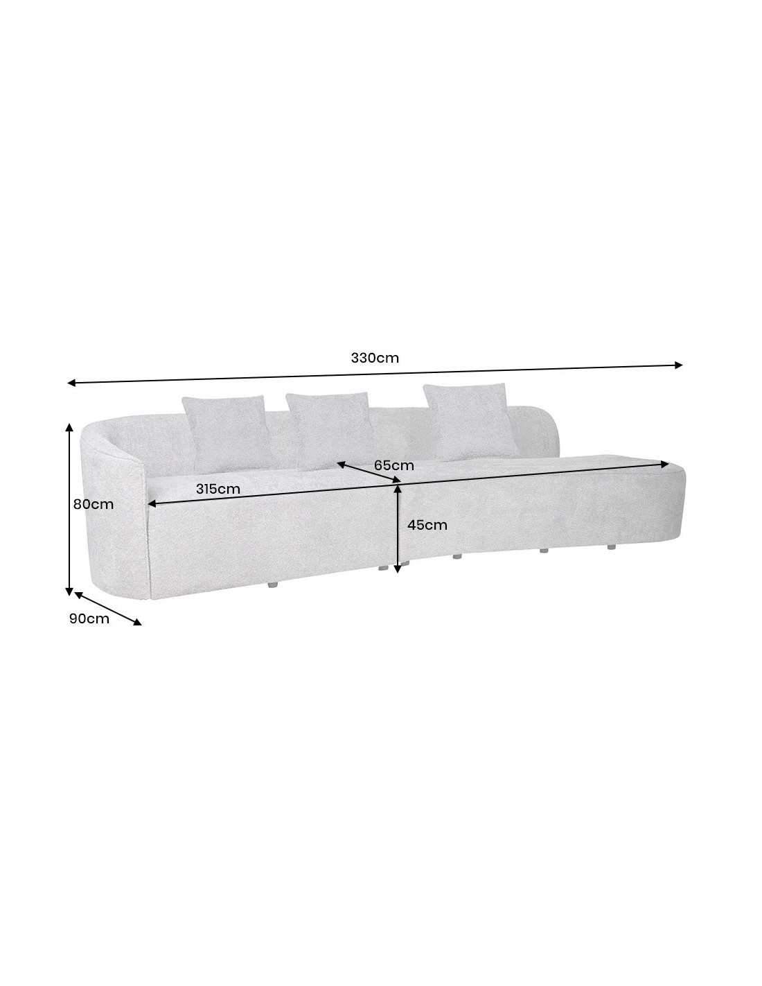 ORION är en majestätisk 3-sits XXL-soffa i bouclé som omedelbart förvandlar vardagsrummet till en harmonisk och inbjudande oas. Den generösa längden på 330 cm ger plats för både avkoppling och sociala stunder – perfekt för långa filmkvällar eller stora sällskap. Den mjuka, taktila boucléklädseln skapar en lyxig loungekänsla i rummet. Soffan är klädd i slitstark bouclé i 100% polyester med fyllning i skum, vilket ger en behaglig komfort och ett ombonat stöd över hela sittdjupet. Den ljusbeige nyansen är lätt att matcha med både modern och skandinavisk inredning och gör ORION till ett tidlöst nav i hemmet. Som bouclésammet-liknande designsoffa kombinerar den estetik med funktion, hög maxbelastning och kvalitativ stoppning för långvarig användning. Mått: Bredd x Höjd x Djup Bredd: 330 cm Höjd: 80 cm Djup: 90 cm Sitthöjd: 45 cm Ryggstödets höjd: 35 cm Avstånd golv till armstöd: 61 cm Sittyta: 315 x 65 cm Max. belastning: 360 kg Vikt: 66.96 kg