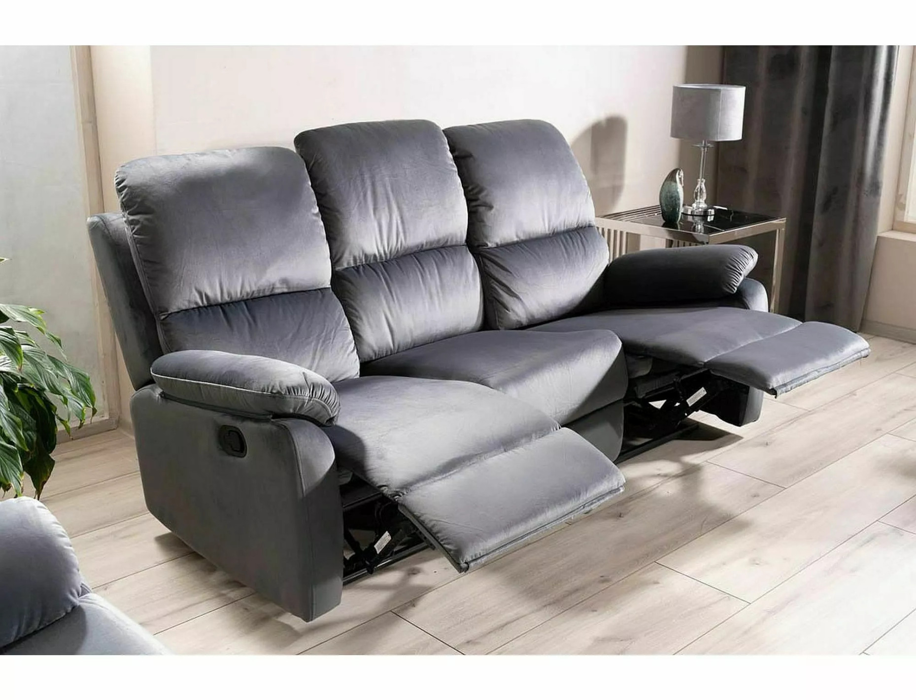 ZENIT är en stilren 3-sits soffa i sammet med en modern kombination av grå klädsel och svart metallstomme. De två ytterplatserna kan fällas ned för extra komfort, medan den mittersta sitter stabilt och upprätt. Den nätta men generösa bredden gör soffan idealisk för både vardagsrum och mindre utrymmen där man vill kombinera avslappning med en elegant look.