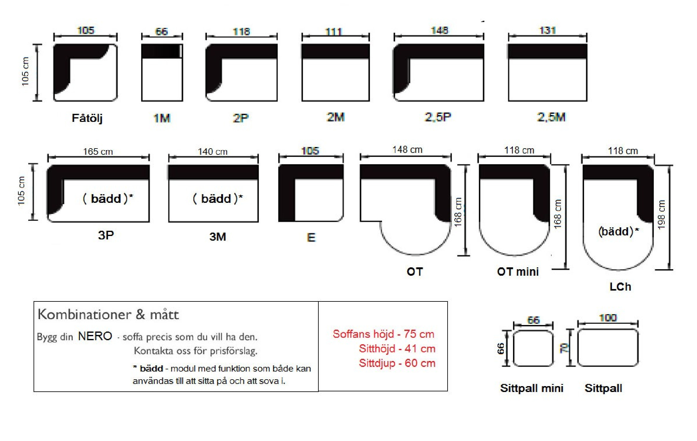 - Kontakta oss för att beställa soffan med en annan kombination / mått / färg / tyg