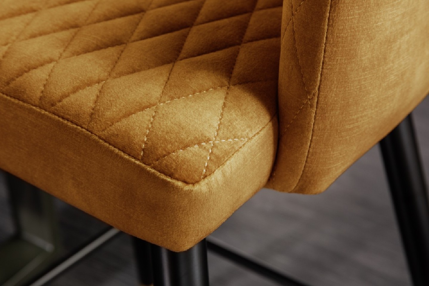 Barstol i senapsgul sammet med dekorativ quiltning. De guldfärgade fotkåporna kompletterar retroutseendet.