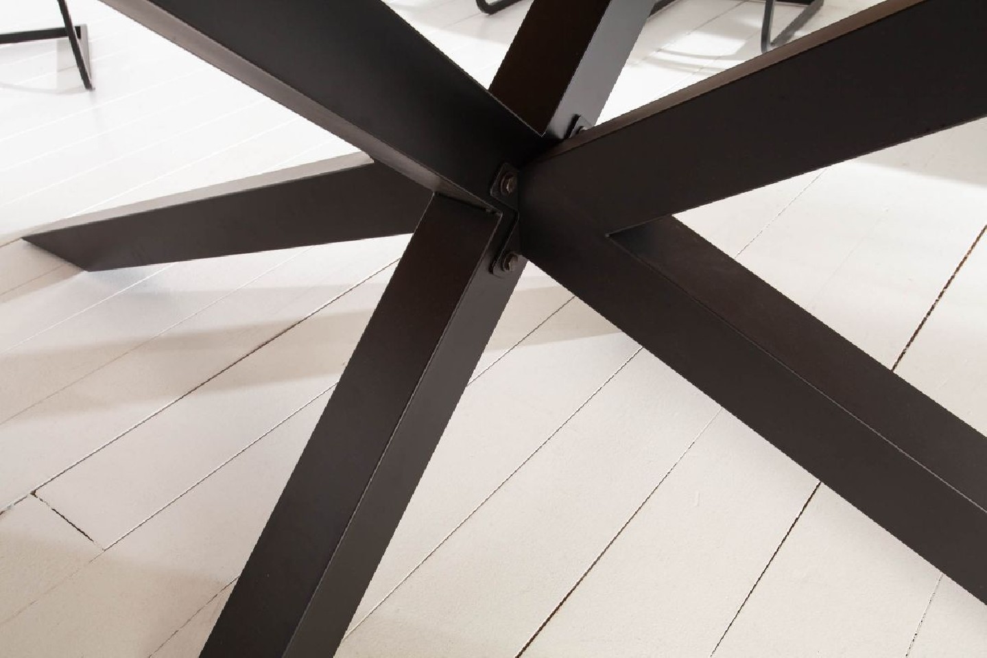 Stort och stiligt matbord i tall. Den massiva metallramen formad som en stjärna skapar ett industriellt utseendet. Träskivan sätts ihop i ett planliknande utseende och kan ha små märken och sågmärken.