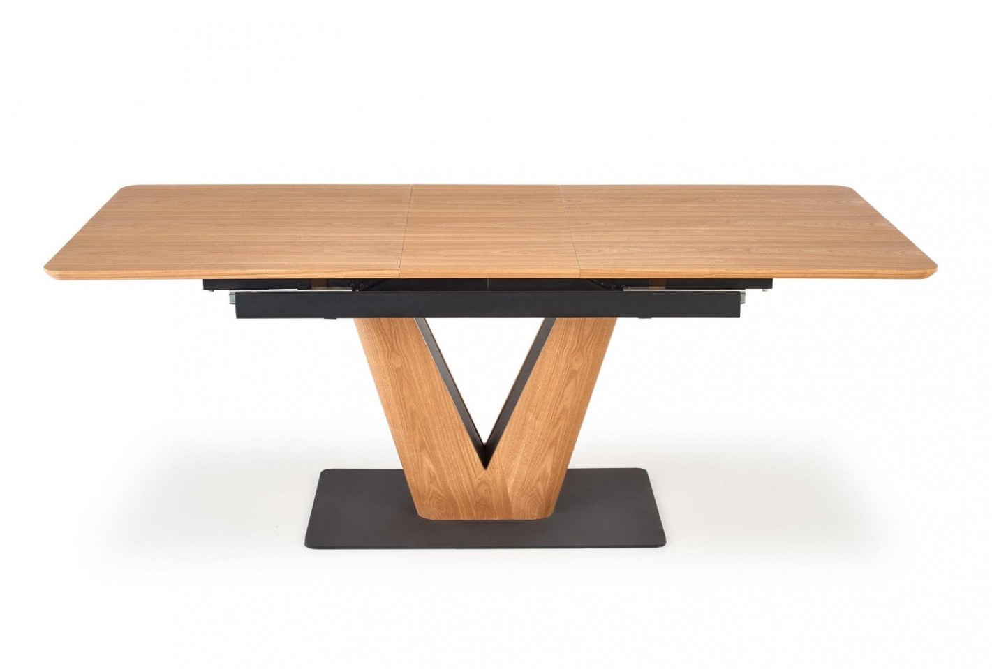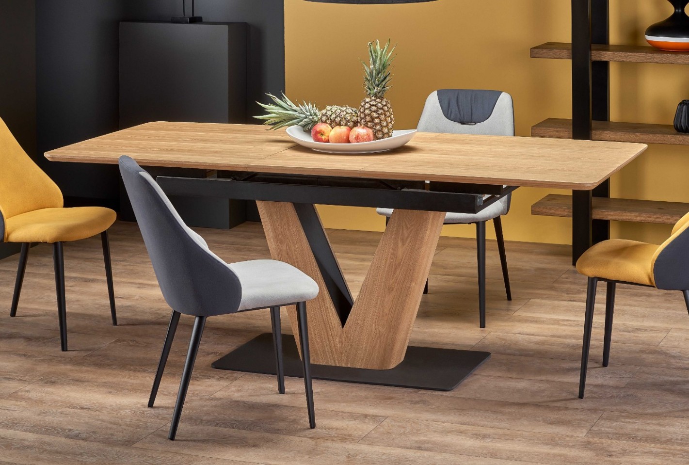 VICCO A är det eleganta förlängningsbara matbordet som kombinerar naturligt trä med svarta dekorativa ben. Bordsskivan är tillverkat av laminerat MDF av ek och benen i pulverlackat svart stål. Bordet präglas av flexibilitet och innovativ materialutveckling. Bordsskivan kan förlängas med utdragsskiva. Perfekt för det moderna stilrena hemmet.