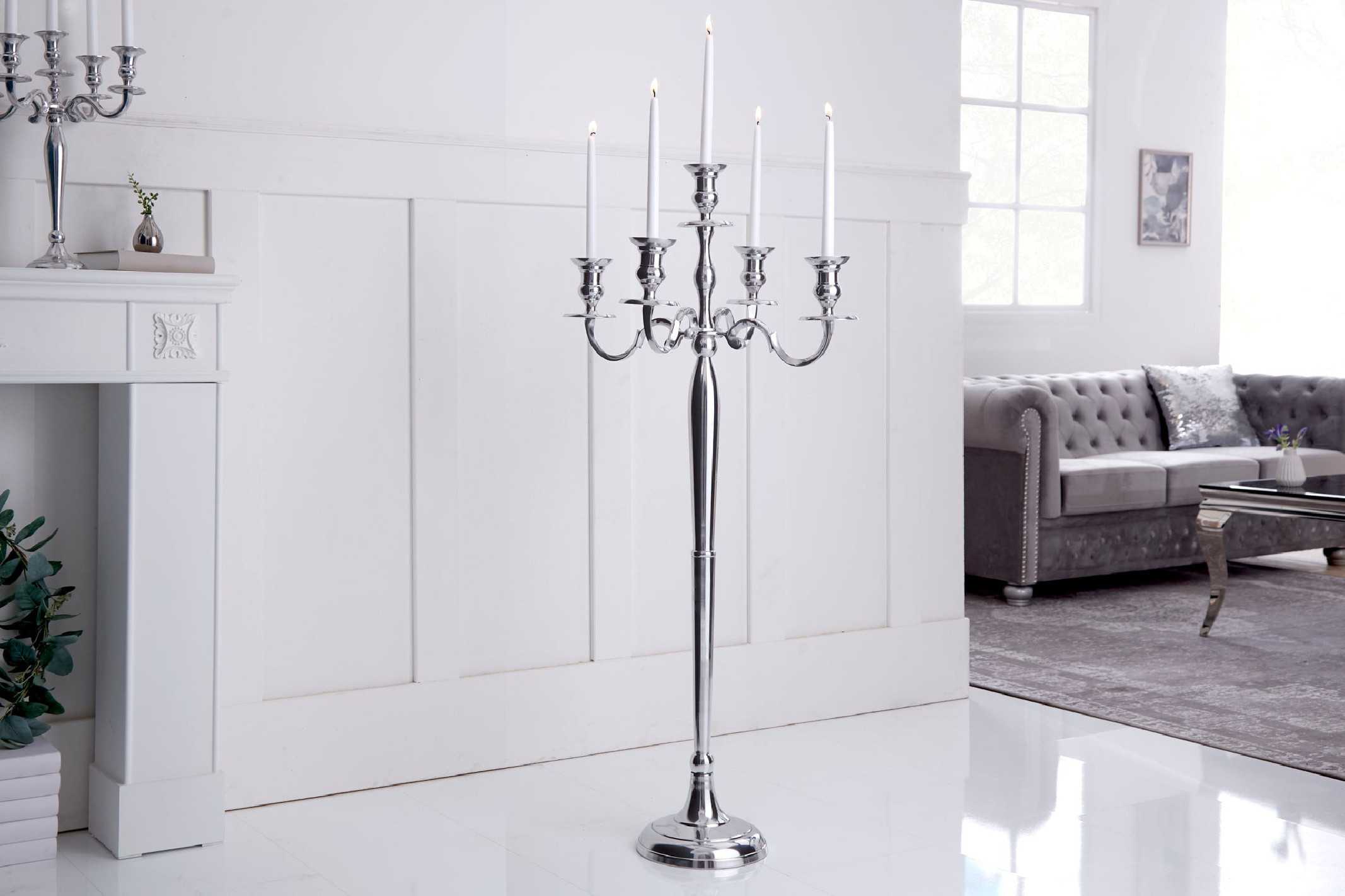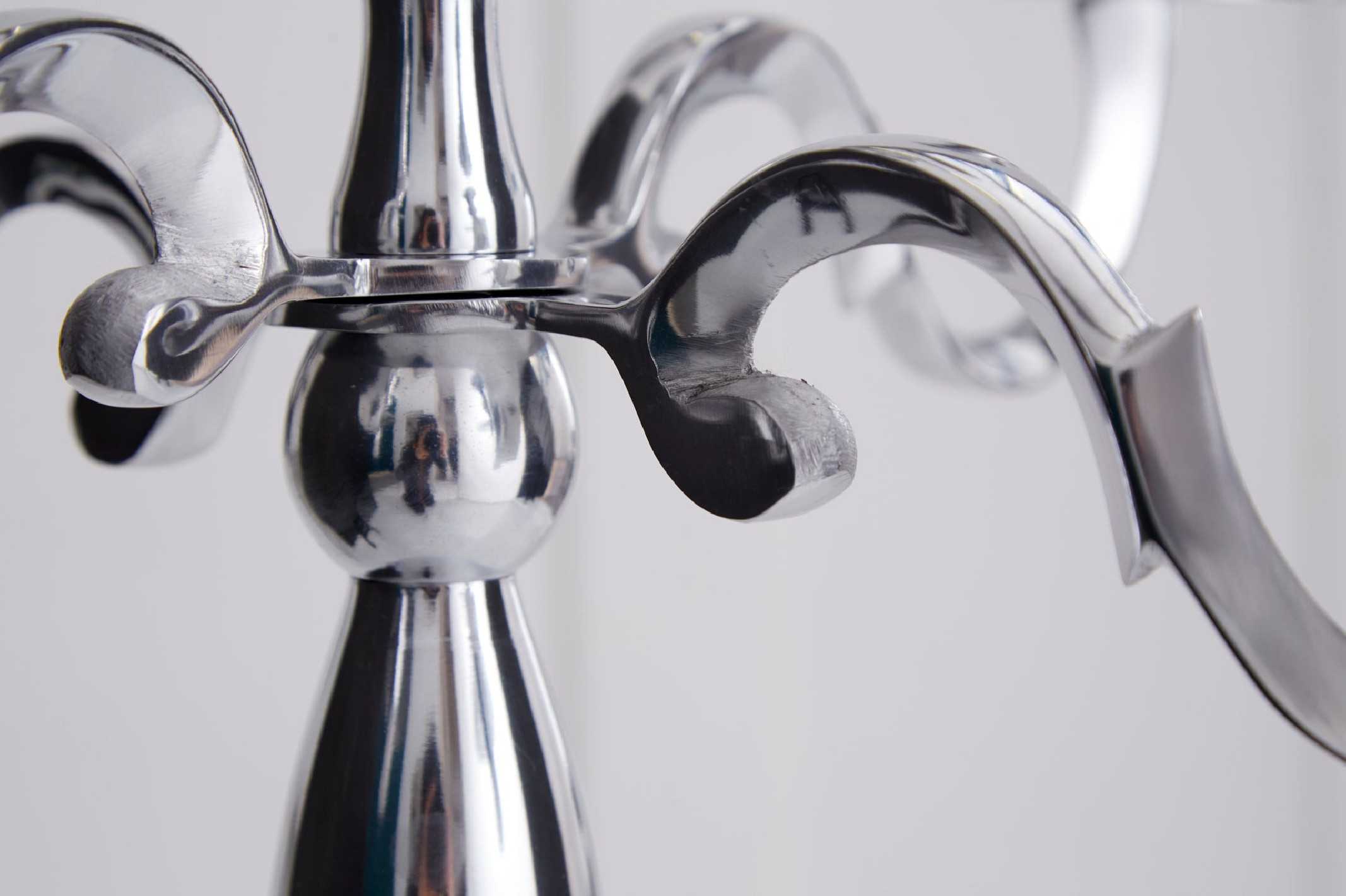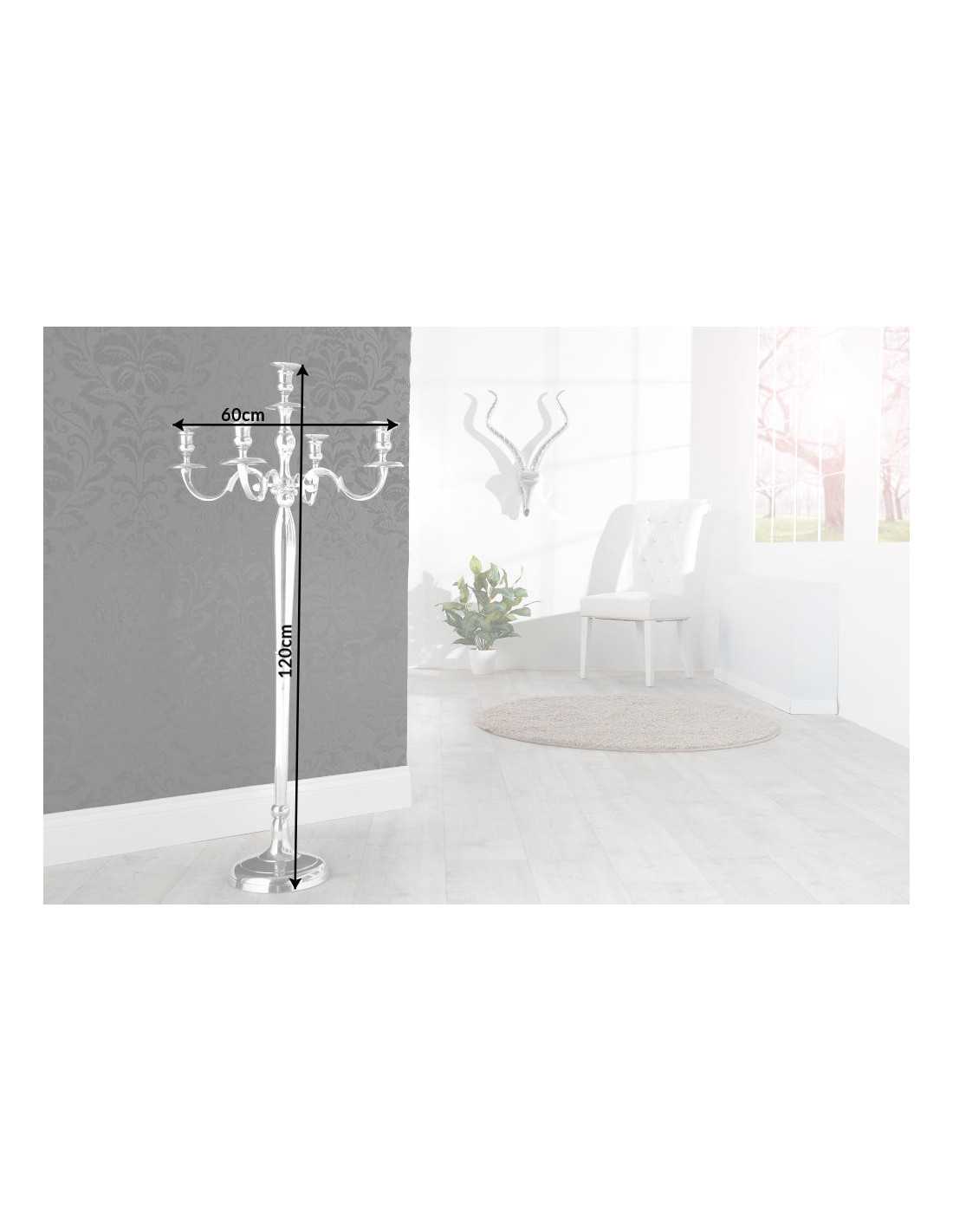 Lyra ljusstake förvandlar ditt hem till en stämningsfull salong med sin majestätiska höjd och fem vackra armar. Den silverfärgade ytan reflekterar ljusets sken och skapar en lyxig, nästan kunglig atmosfär i rummet. Tillverkad i en robust aluminiumlegering kombinerar denna 5-armade ljusstake modern elegans med klassisk barockkänsla. Den slanka siluetten och den polerade, silverfärgade finishen gör den till ett perfekt blickfång på matsalsbord, sideboard eller golv, oavsett om du inreder i modern, klassisk eller lyxig hotellstil. En hög ljusstake i metall som ger rummet karaktär och stil, år efter år. Mått: Bredd x Höjd x Djup 60 x 120 x 60 cm