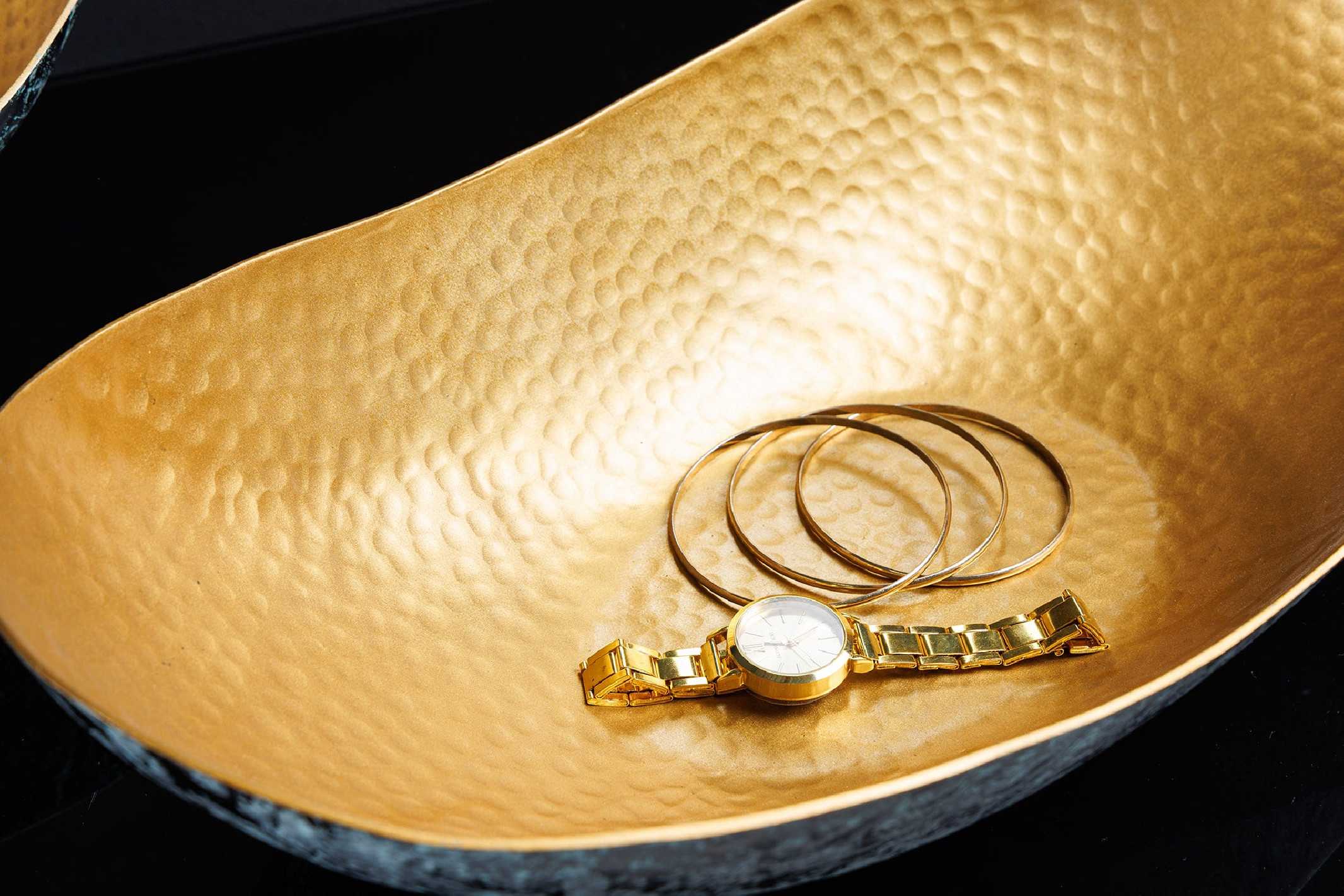 Nebula är en dekorationsskål som genast fångar blicken med sitt konstnärliga uttryck. Den hamrade ytan i guld och patina skapar ett lyxigt blickfång som förvandlar soffbord, sideboard eller matsalsbord till en stilfull scen. Skålen är tillverkad i en robust metall–aluminiumlegering som ger en stabil och tålig känsla, samtidigt som den tunna profilen ger ett elegant intryck. Den handarbetade, hamrade strukturen ger varje dekorationsskål en unik karaktär, där det varma guldet möter den åldrade patinan i ett perfekt möte mellan orientalisk tradition och modern design. Använd den som dekorskål, ljusfat eller som exklusiv centerpiece på ditt bord. Mått: ca 43–54 cm längd Vikt: 1.5 kg