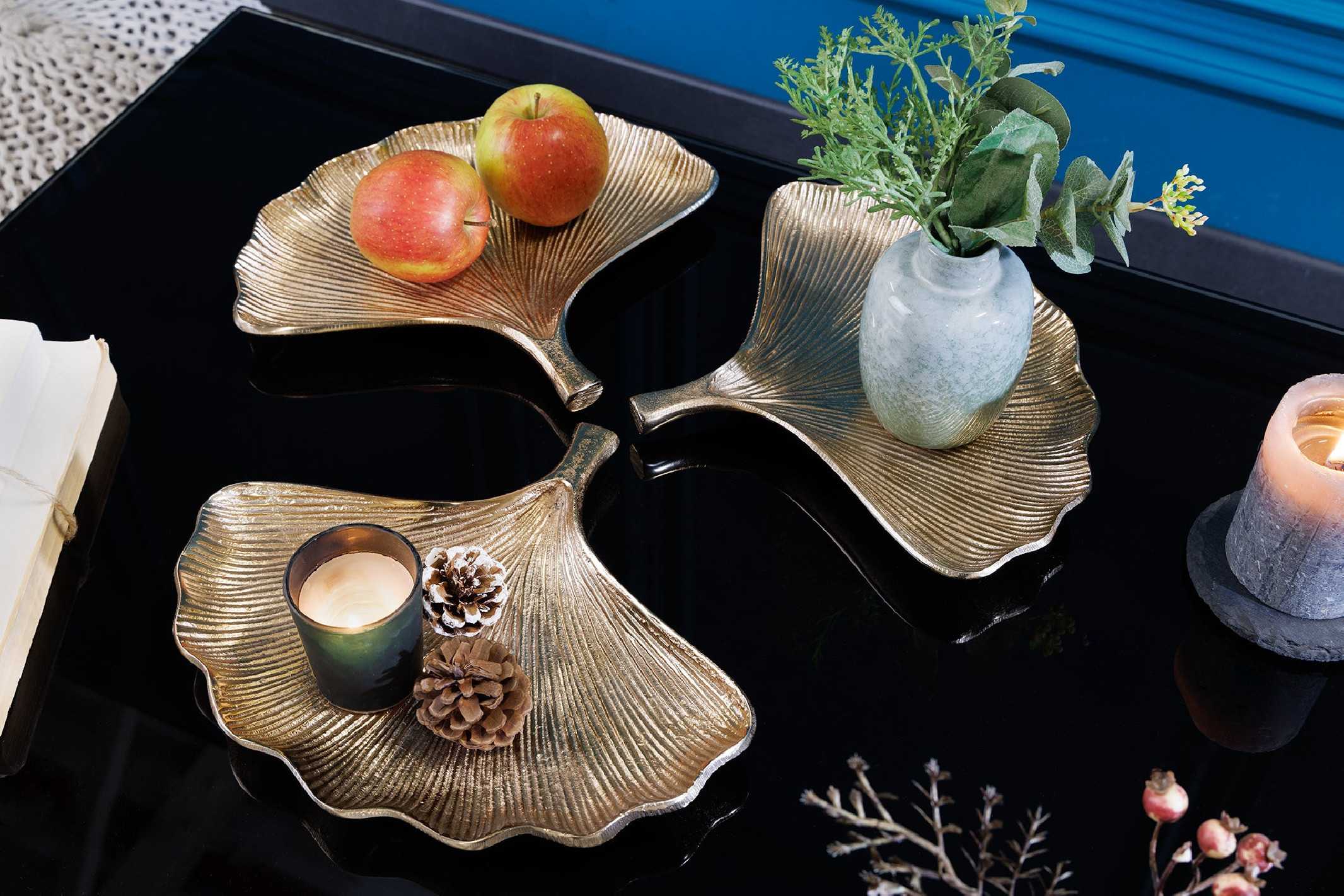 AURIGA skålset om 3 i guld förvandlar enkelt dina hyllor, soffbord och sidobord till stilfulla blickfång. De glänsande dekorationsskålarna tillför en modern, lyxig känsla och skapar en varm, inbjudande atmosfär i rummet. Tillverkade i metall av aluminiumlegering med elegant gyllene finish ger dessa dekorskålar ett modernt uttryck som passar både minimalistisk och mer personlig inredning. Använd skålarna tillsammans eller var för sig på ett soffbord, matbord eller i en hylla för att skapa djup och variation i din heminredning. Perfekt som dekorationsskålar vid dukning, som skålset i vardagsrum eller som detalj i en stilren stilleben. Mått: Ej angivna (set om 3 dekorationsskålar)