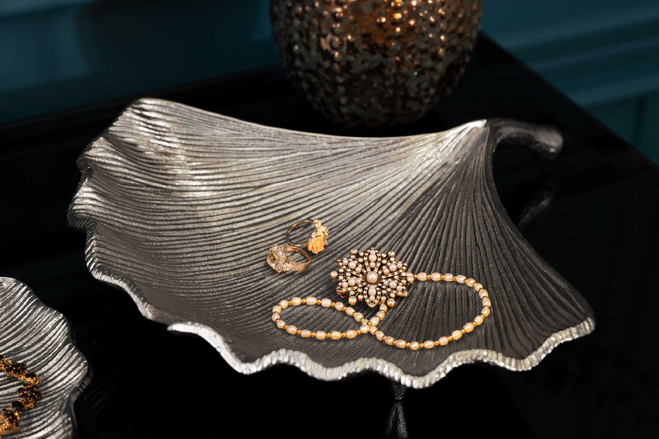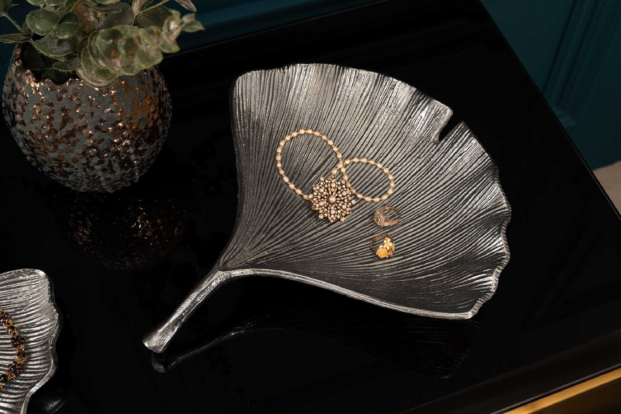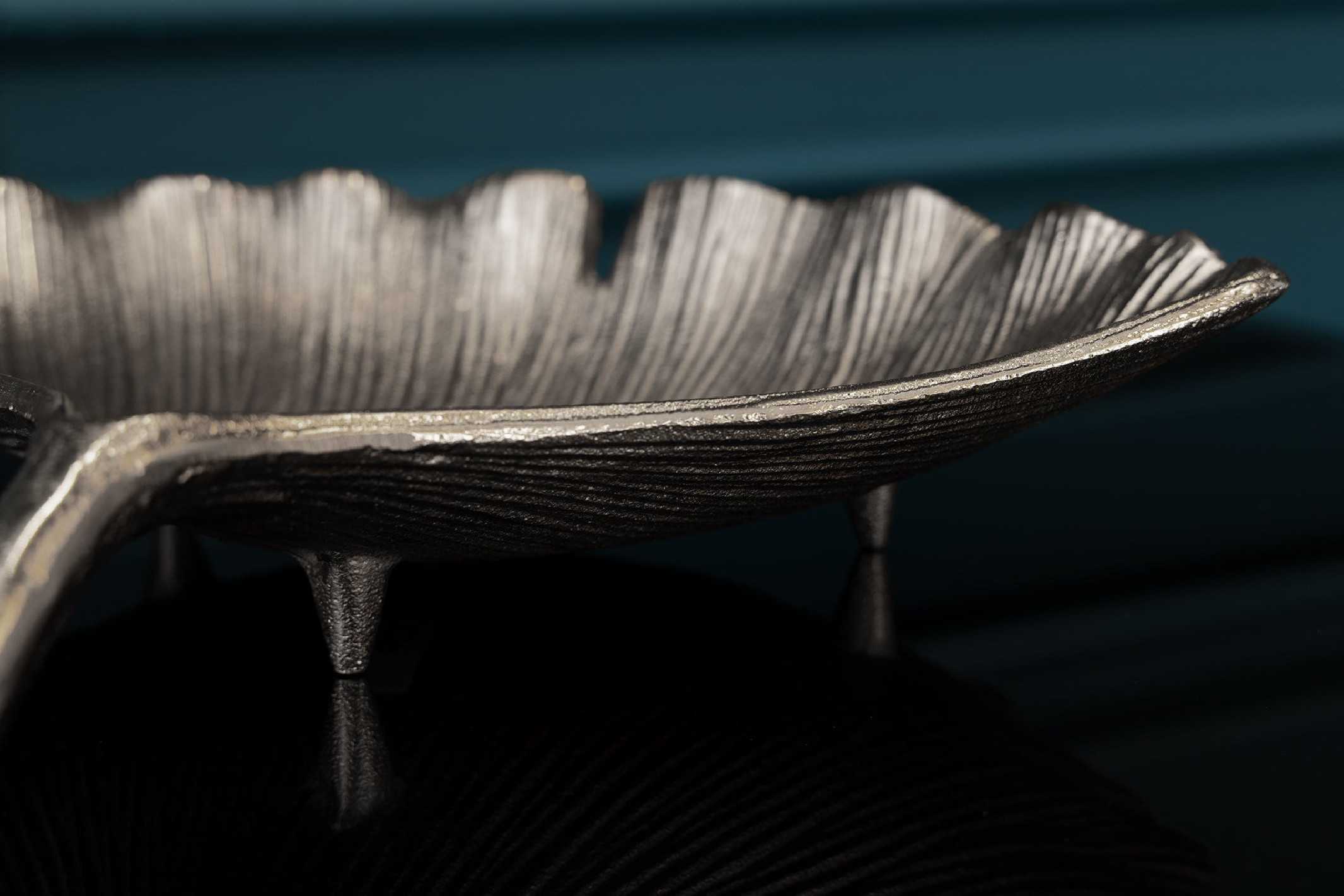 GINKGO NEBULA är en dekorationsskål som fångar blicken direkt – en skimrande silverfärgad tolkning av den ikoniska ginkgo-bladformen som ger ditt hem en känsla av lyx och harmoni. Placera den som ett stilfullt blickfång på soffbordet, matsalsbordet eller sideboardet och låt den förvandla rummet med sin skulpturala närvaro. Skålen är tillverkad i en slitstark metall/aluminiumlegering med en elegant silverfinish som reflekterar ljuset på ett mjukt och sofistikerat sätt. Den dekorativa skålen fungerar lika bra som ensam inredningsdetalj som tillsammans med ljus, stenar eller andra små dekorationer. Tack vare sin genomarbetade design och tidlösa metalllook passar den in i både modern och klassisk inredning, och blir en självklar centerpiece i vardagsrum, matsal eller hall. Mått: Bredd x Höjd x Djup: 33 x 6 x 30 cm