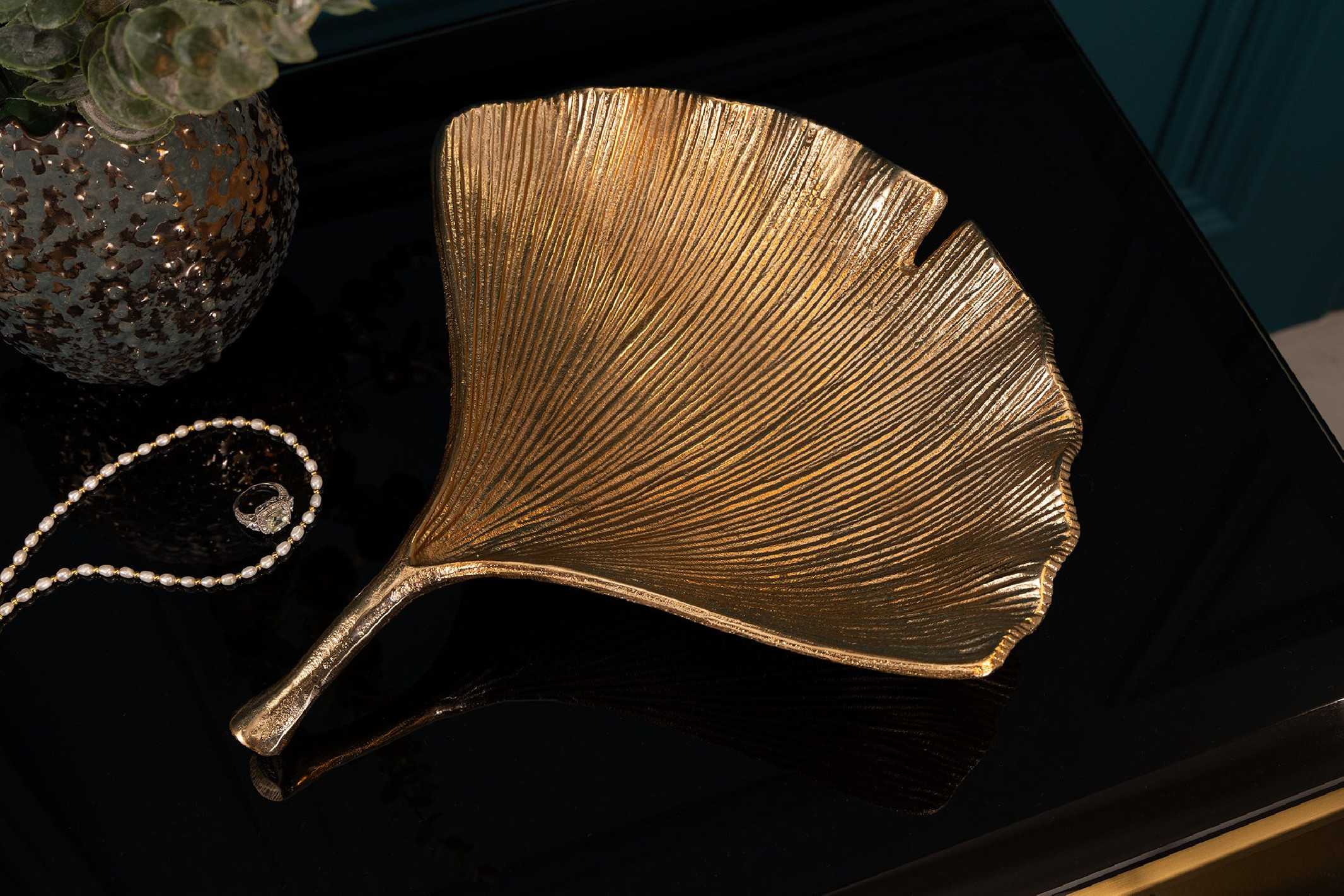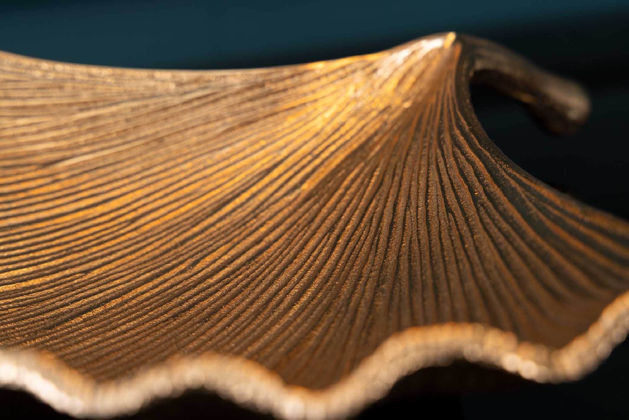 AURIGA dekorationsskål i guld sprider ett subtilt skimmer över rummet och ger din inredning en elegant, lyxig känsla. Den skulpturala formen blir ett blickfång på soffbord, sidobord eller matbord och lyfter enkelt helhetskänslan i ditt hem. Tillverkad i hållbar metall-aluminiumlegering med en detaljrik form inspirerad av den eleganta ginkgobladet, är denna dekorationsskål både dekorativ och funktionell. Den gyllene ytan ger en sofistikerad lyster som passar perfekt i en modern, exklusiv heminredning. Använd skålen som prydnad på ett sideboard, som bordsdekoration eller som stilfull förvaring av småsaker för att skapa en sammanhängande, elegant inredning. Mått: Bredd 33 x Höjd 6 x Djup 30 cm