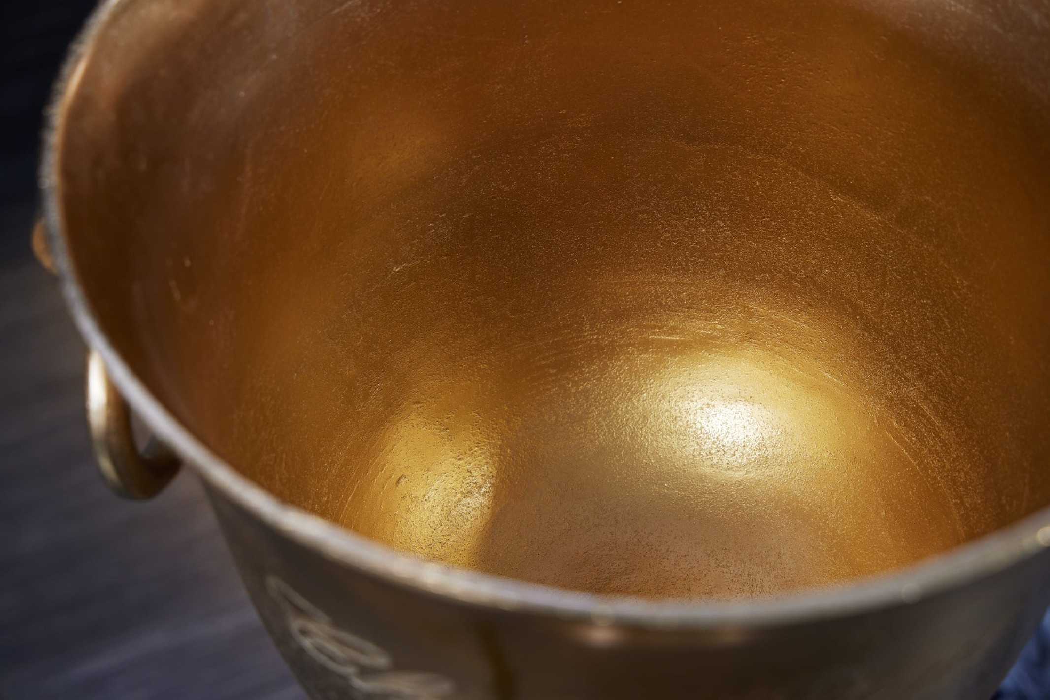 AURIGA champagnekyl i antikguld förvandlar varje dukning till en glittrande fest. Den generösa höjden gör den till en elegant blickfångare som ger rummet en lyxig och högtidlig känsla. Tillverkad i en slitstark aluminiumlegering kombinerar denna champagnekyl stilren design med praktisk funktion. Den antikguldfärgade ytan ger en exklusiv hotellkänsla och passar perfekt till bröllop, högtider och festliga middagar. Fyll AURIGA champagnekyl med is och håll champagne, cava eller prosecco perfekt kylda under hela kvällen – ett måste för dig som vill ha en dekorativ champagnekylare med lyxig karaktär. Mått: Höjd: 80 cm Vikt: 4,74 kg