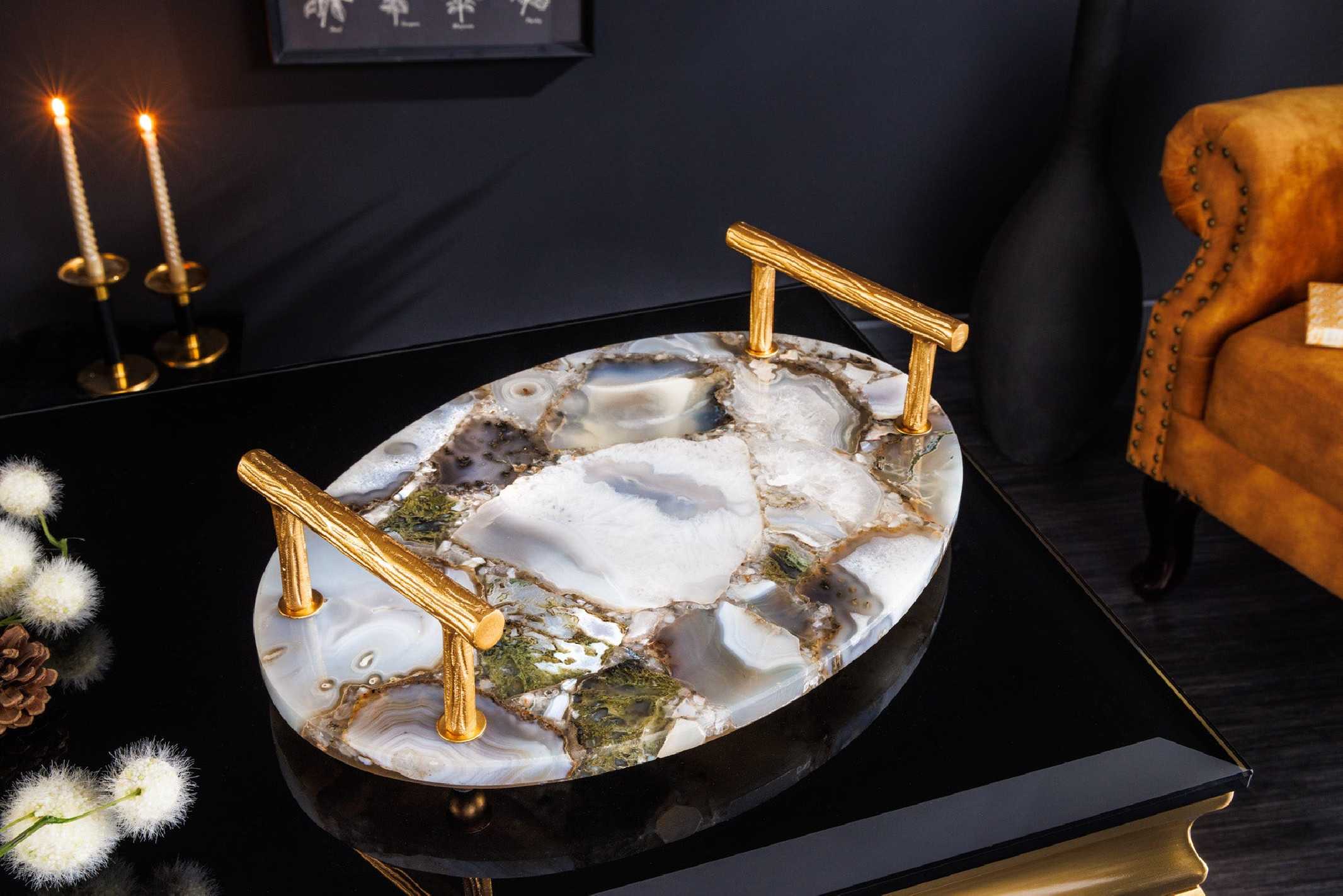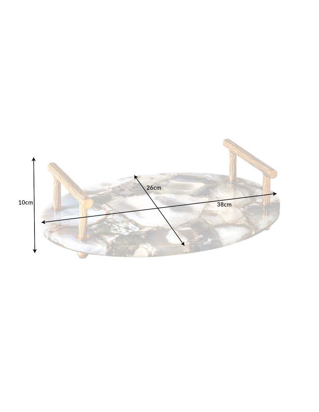 NOVA serveringsbricka förvandlar vardagen till ren lyx med sin djupblå agatyta och elegant gyllene detaljer. Perfekt som dekorationsbricka på soffbordet eller som stilfull serveringsbricka när du vill imponera på gäster. Den blanka ytan i blå agat ger en unik, naturlig struktur där varje bricka får sitt eget uttryck. De stabila handtagen i guldfärgad metallaluminium-legering skapar en exklusiv känsla och gör brickan både dekorativ och praktisk att bära. Använd NOVA som serveringsbricka, smyckesfat eller som bas för stilleben på sideboard eller matbord – en tidlös detalj i modern heminredning. Mått: Bredd x Höjd x Djup 38 x 10 x 26 cm