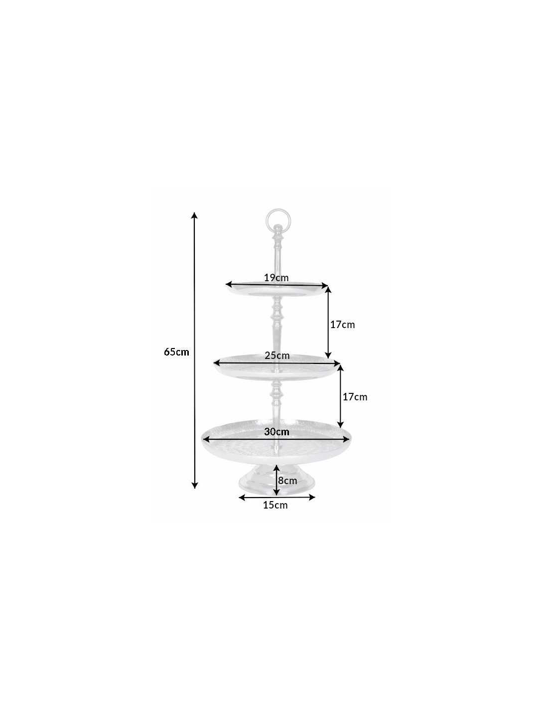 Lyra etagère förvandlar dukningen till en liten galax av glans. Med tre våningar i skimrande silver blir den en elegant mittpunkt på bordet och lyfter allt från fika till festliga desserter. Denna etagère i metall-aluminiumlegering är både stabil och stilren, med en vacker hamrad yta som ger ett levande ljusspel. Perfekt som serveringsfat, kakfat eller dekorationsställ i vardagsrum, kök eller matsal. Den hamrade silverfinishen ger en tidlös, orientalisk känsla som passar lika bra i en modern som klassisk inredning. Tack vare den robusta konstruktionen står etagèren stadigt även när alla tre brickor är fullt lastade. Mått: Bredd x Höjd x Djup: 30 x 65 x 30 cm