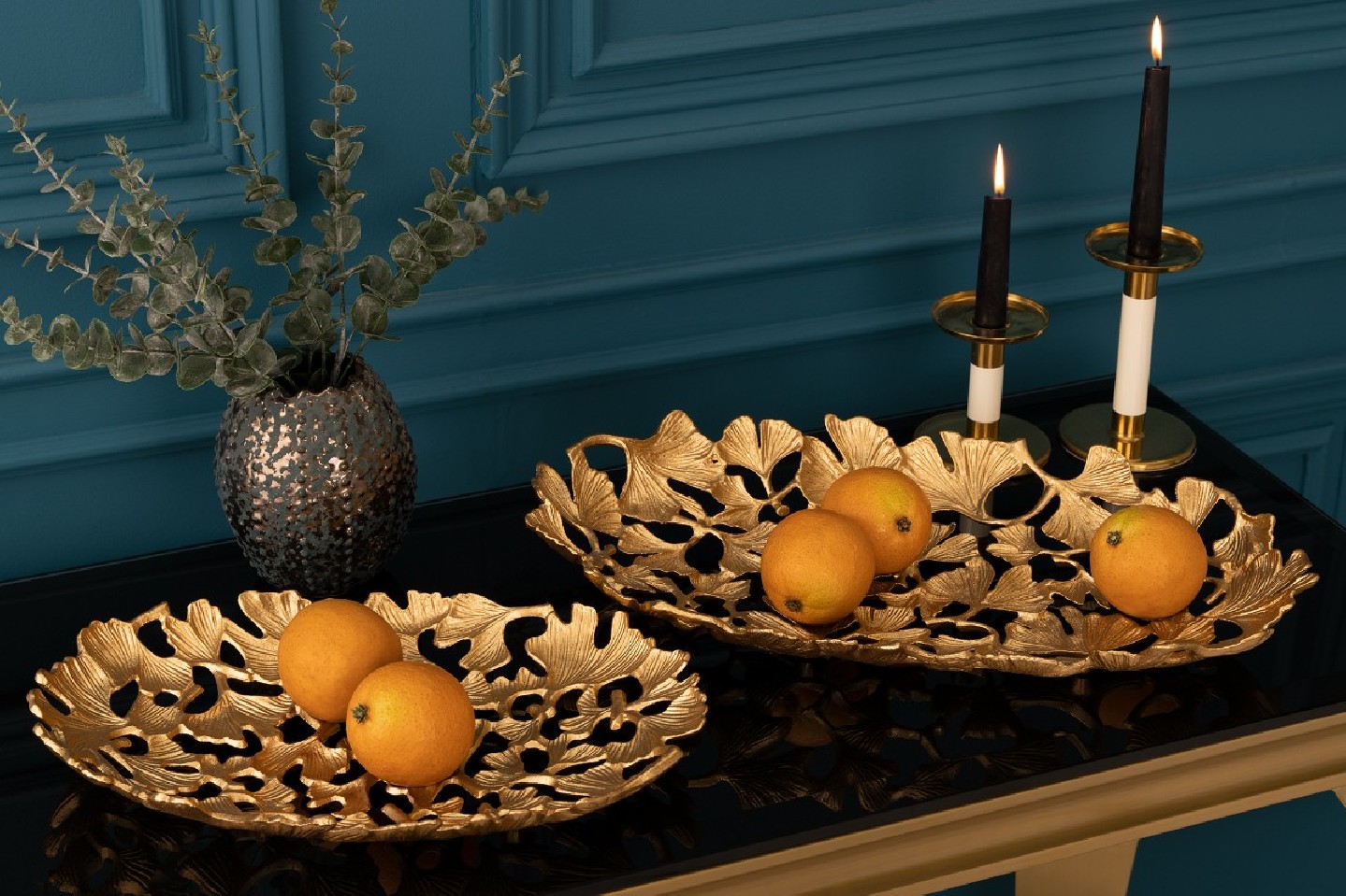 Vacker skål med design av löv i guldfärg. Skålen ger en inbjudande känsla på bordet.