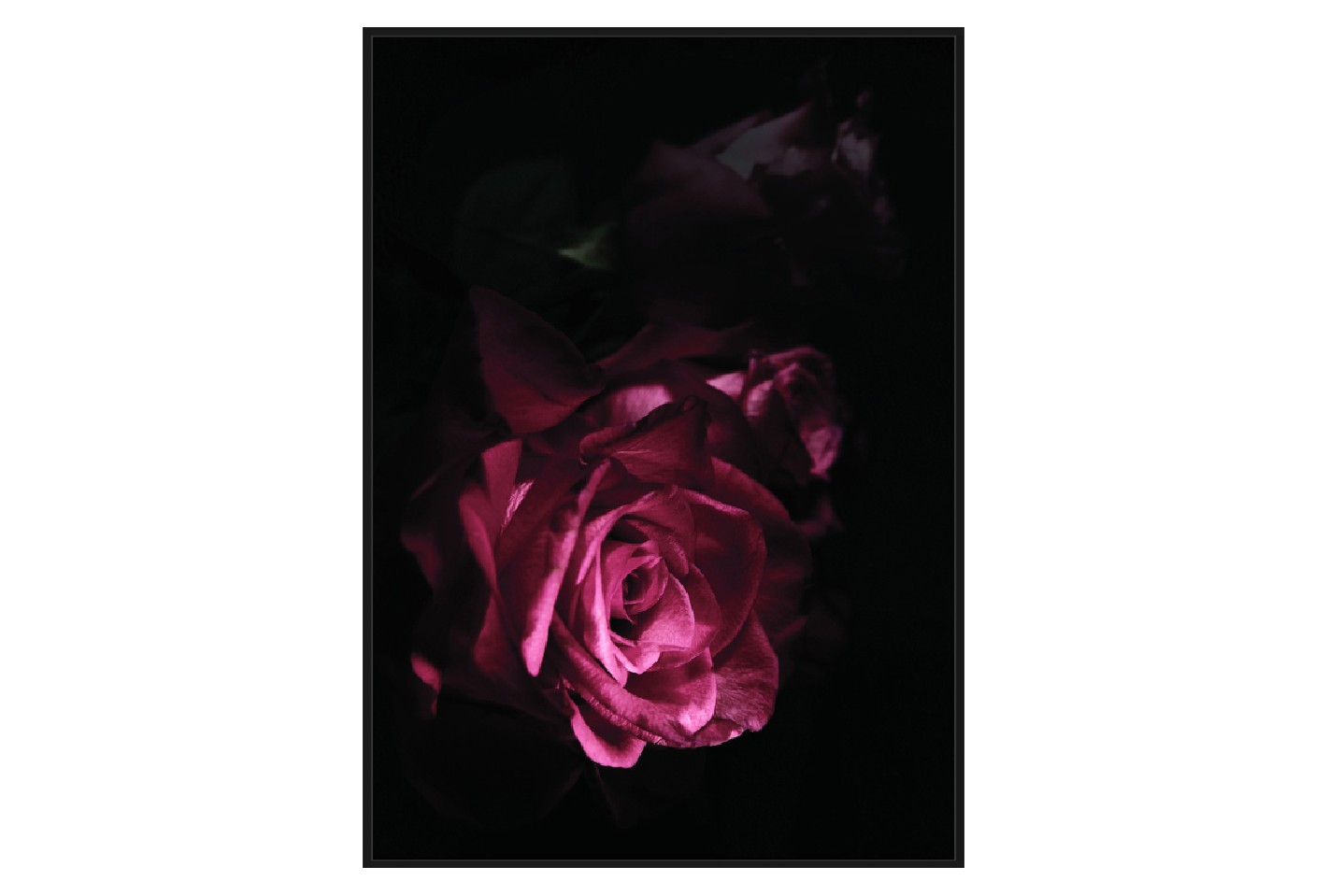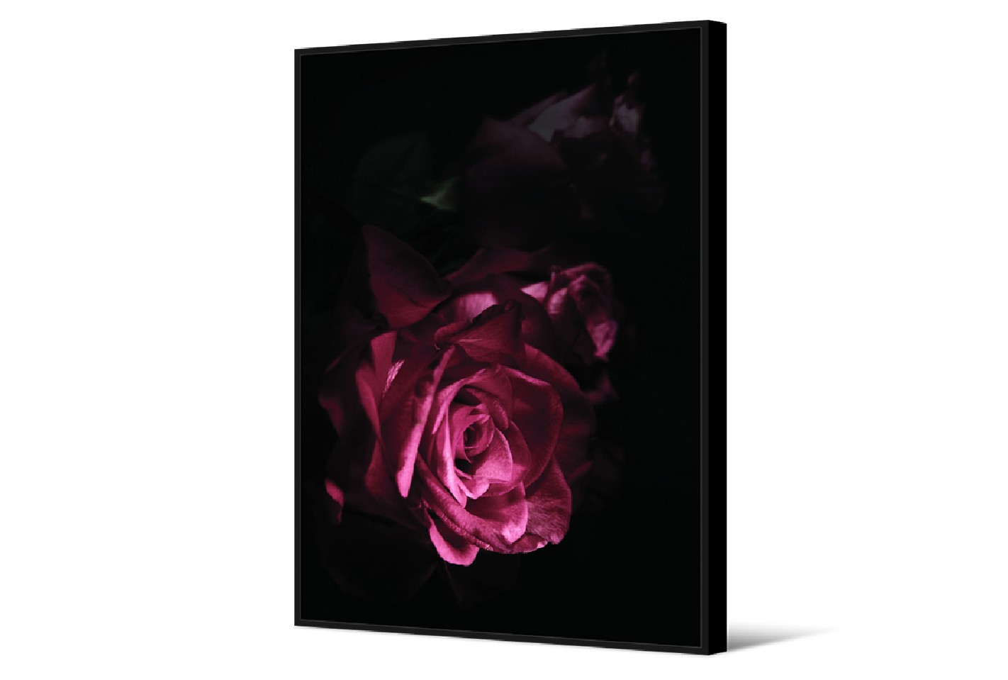 Vacker tavla med motiv av en ros. Duken är omgiven av en amerikansk lådram med ett litet avstånd mellan bilden och ramen. Tavlan blir ett blickfång i vilket rum som helst.