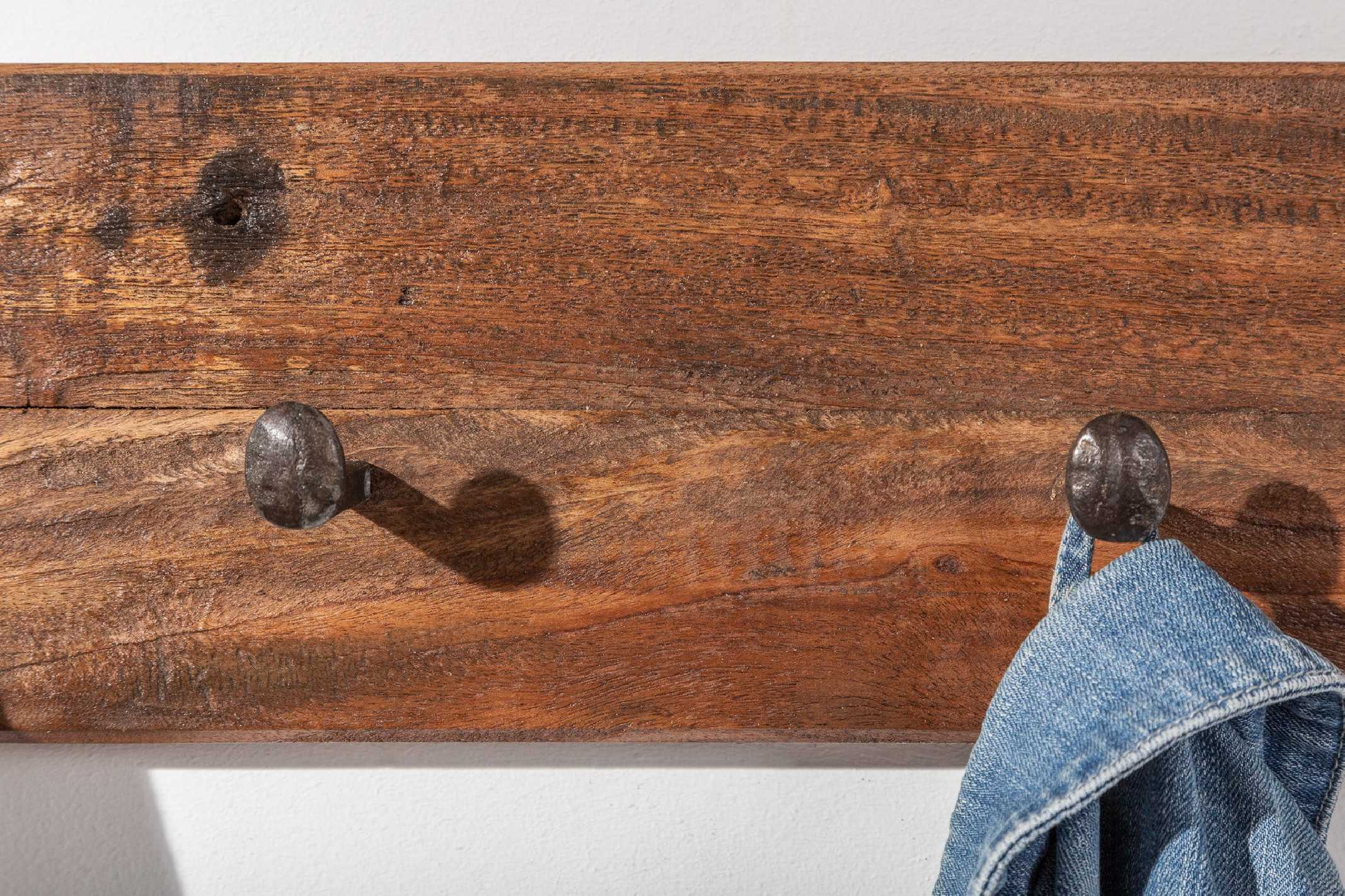 POLLUX är en väggmonterad hatthylla som för in naturens lugn i din hall. De levande ådringarna i det återvunna träet ger en varm, rustik känsla som lyfter hela rummet. Denna vägghängda klädhängare är tillverkad av återvunnet trä och teakträ med robusta metallspikar som skapar en stabil och hållbar konstruktion. Den naturliga färgen gör att hatthyllan enkelt passar ihop med både modern och klassisk inredning, och den kompakta storleken gör den perfekt som vägghängd klädhängare i mindre hallar eller som extra förvaring i korridorer. En stilren väggmonterad hatthylla i massivt trä som kombinerar miljömedvetenhet med tidlös design. Mått: Bredd 90 cm x Höjd 15 cm x Djup 7 cm