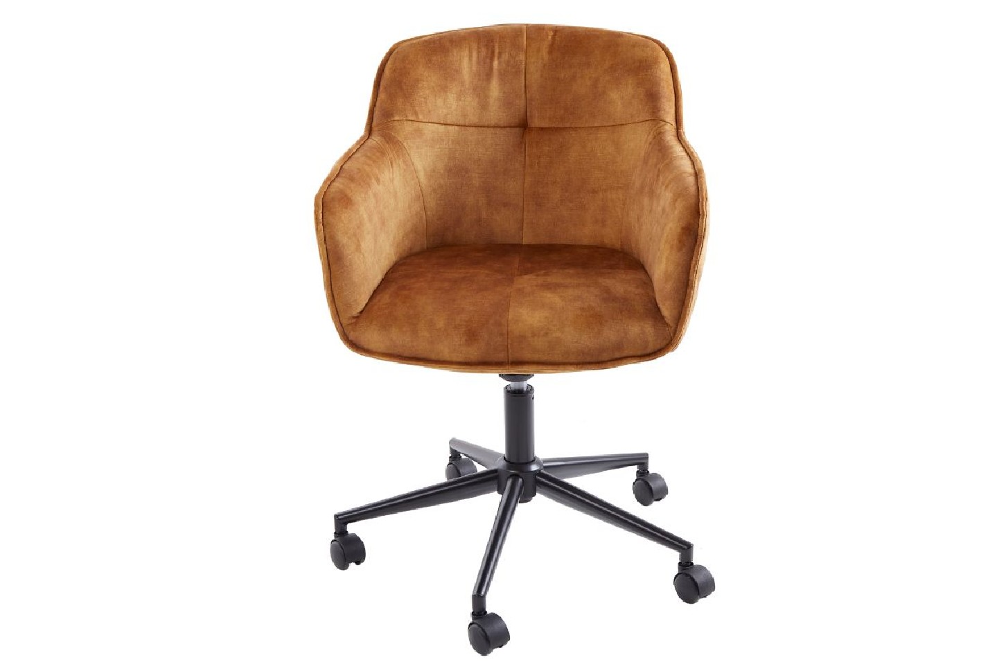 Kontorsstol i sammet med dekorativ quiltning. Den har en retor stil och kan bekvämt justeras i höjd med en spak.