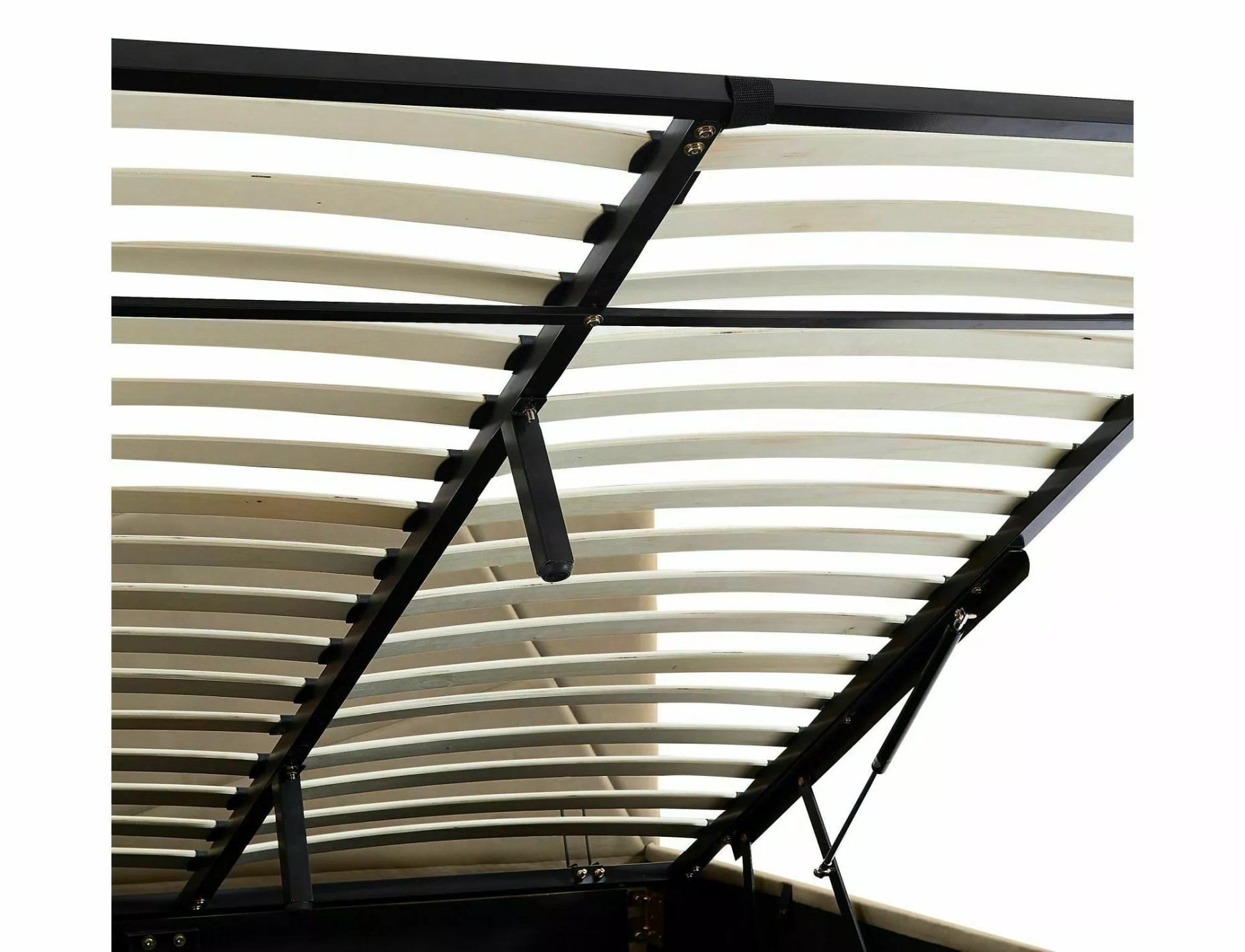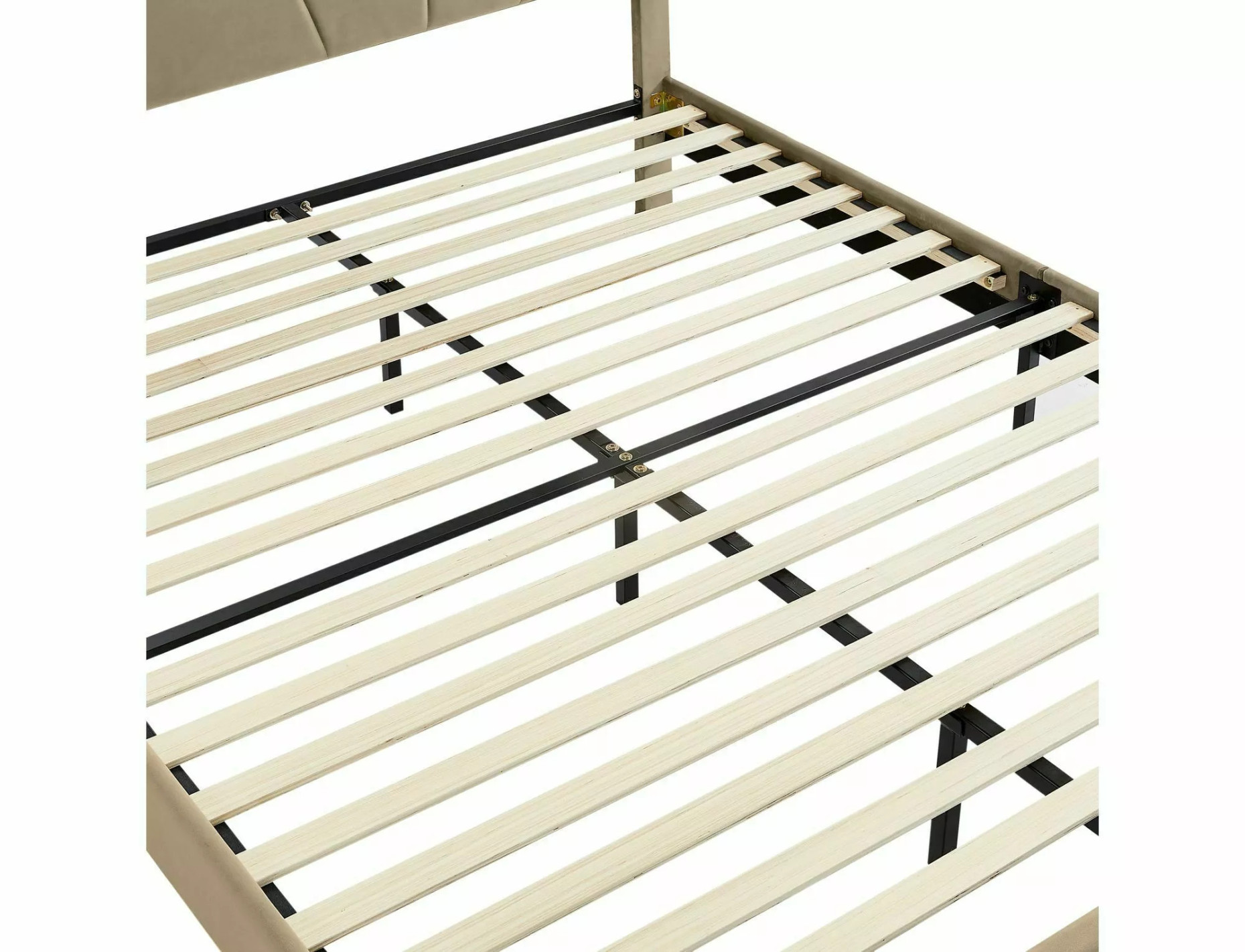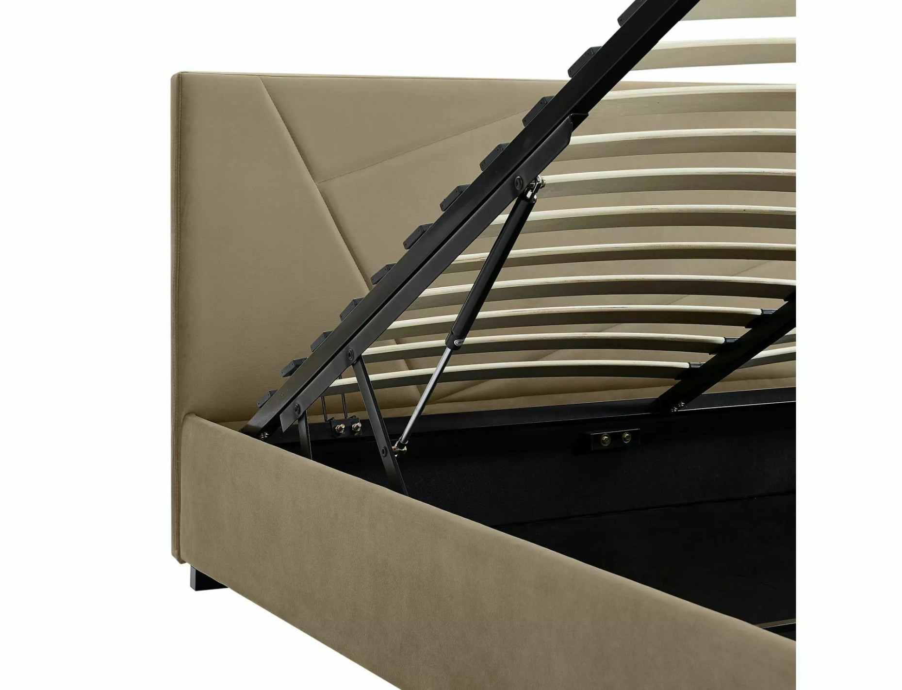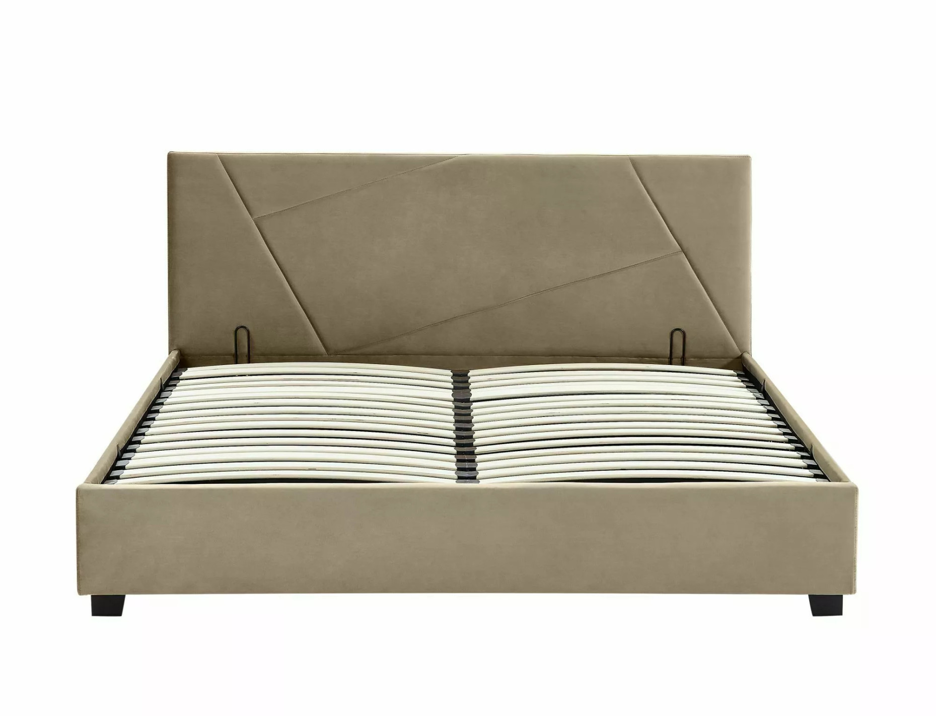 Sängen är klädd i slitstark sammetsliknande tyg som är mjukt att ta på men samtidigt anpassat för dagligt bruk. Den medföljande lamellbotten består av böjda lameller placerade i elastiska hållare för bättre komfort och stöd. Gasfjädrar gör det enkelt och smidigt att lyfta upp botten för att nå förvaringsutrymmet. Obs: förvaringsutrymmet har mjuk botten.