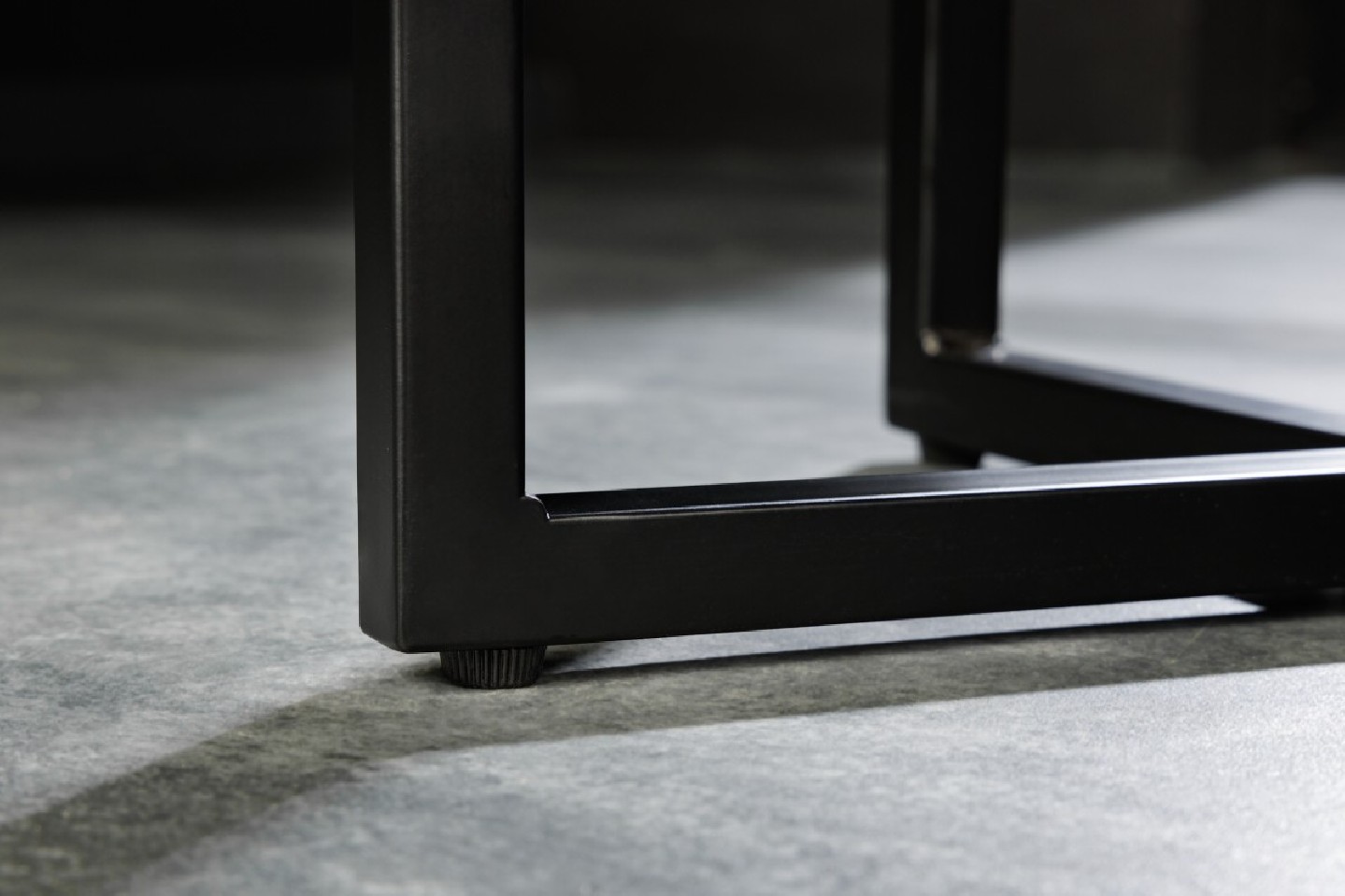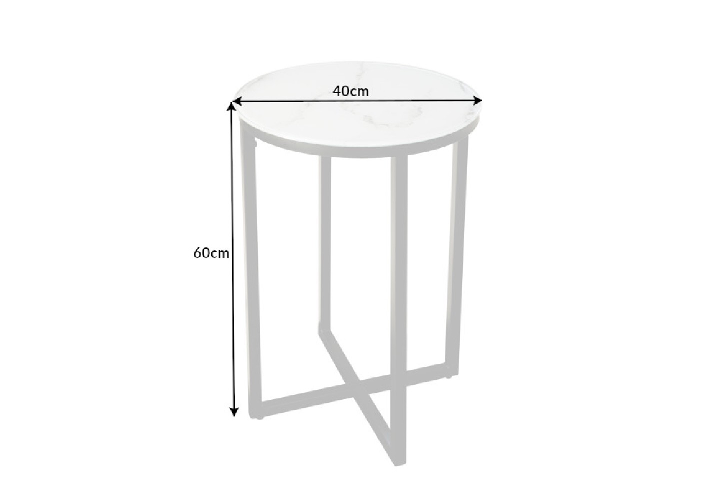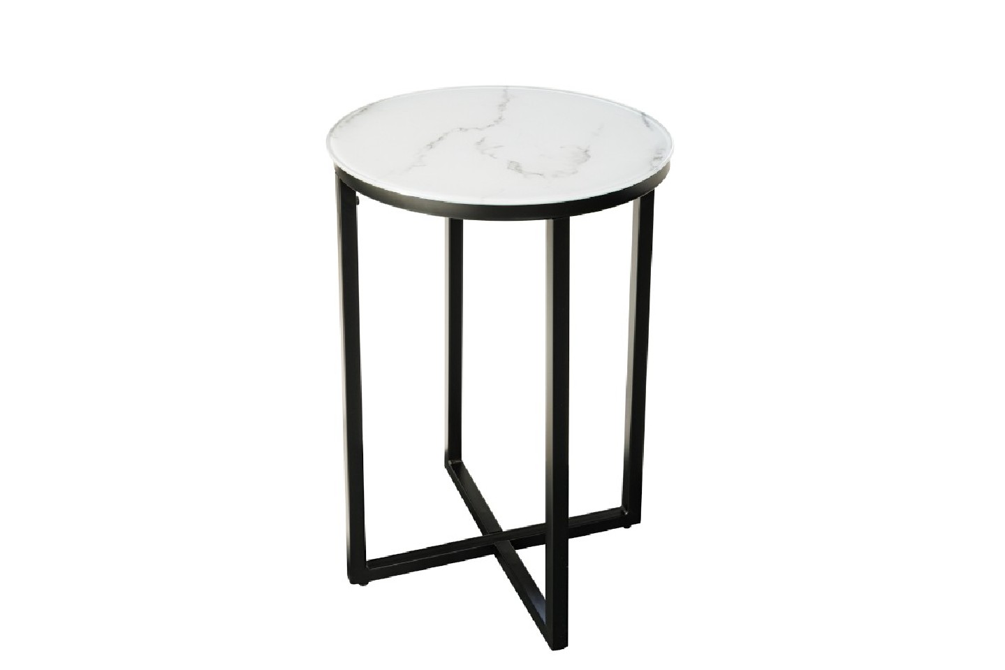 Vackert sidobord i vitt marmorutseende. Ramen är svart och ger en snygg kontrast.