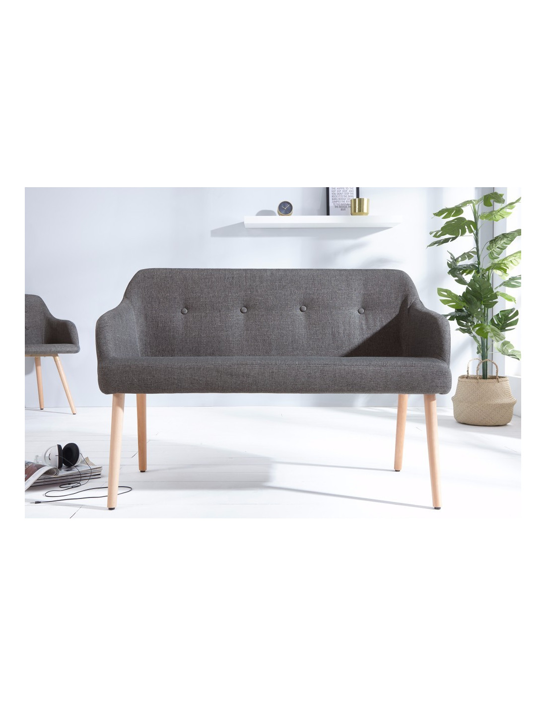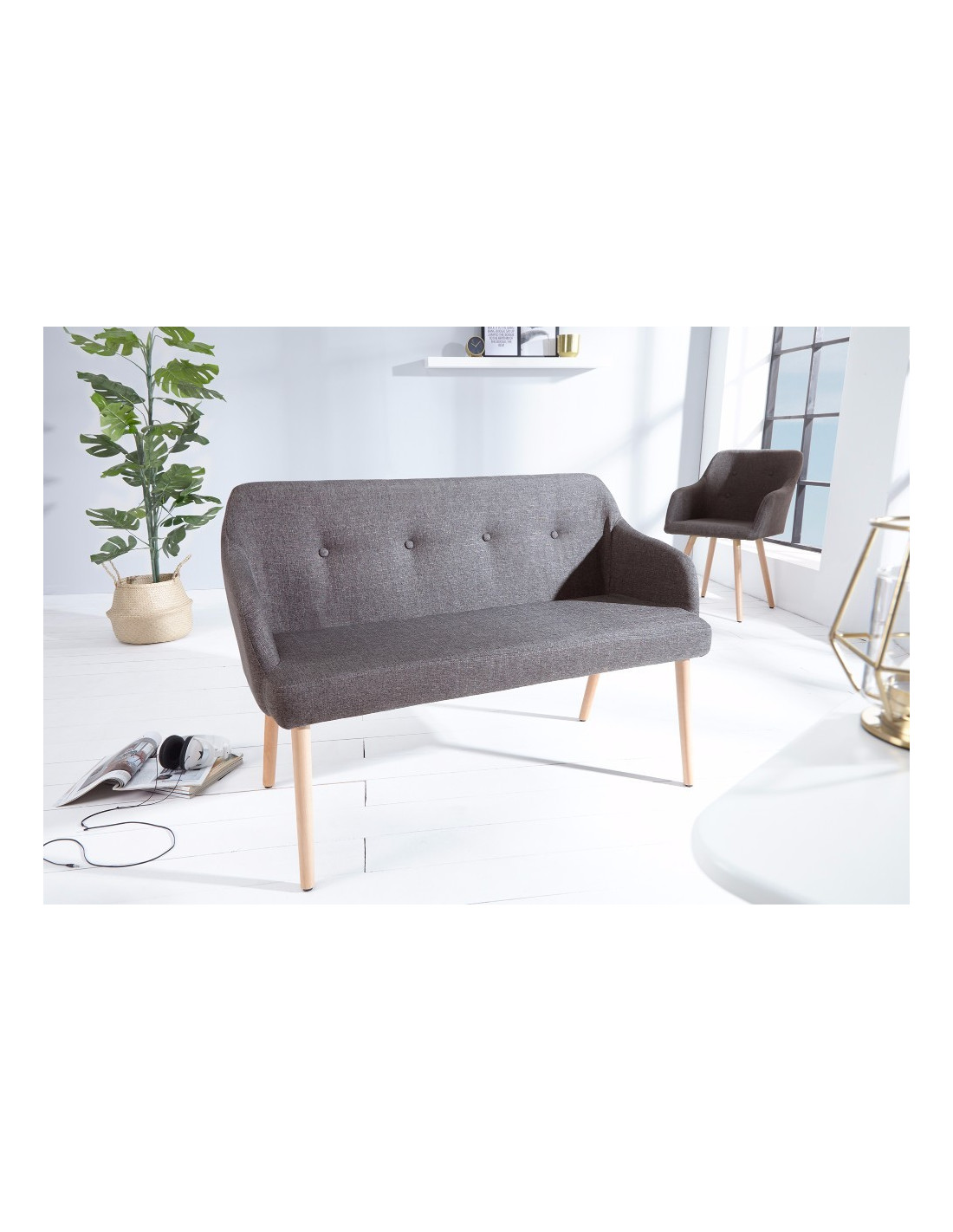 NORDIC är en sittbänk som redan vid första anblicken utstrålar hemtrevnad och stil. De robusta benen i ljus bok och den högkvalitativa klädseln i polyester är uppfriskande och återspeglar den trendiga skandinaviska designen. Förutom den bekväma klädseln har den också armstöd som gör att du sitter extra skönt.