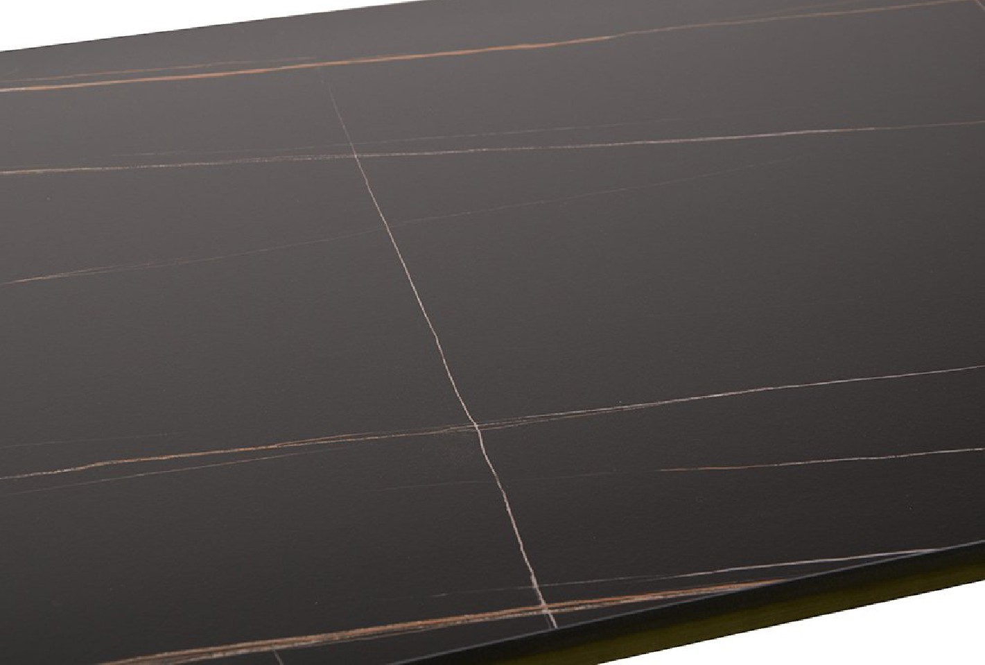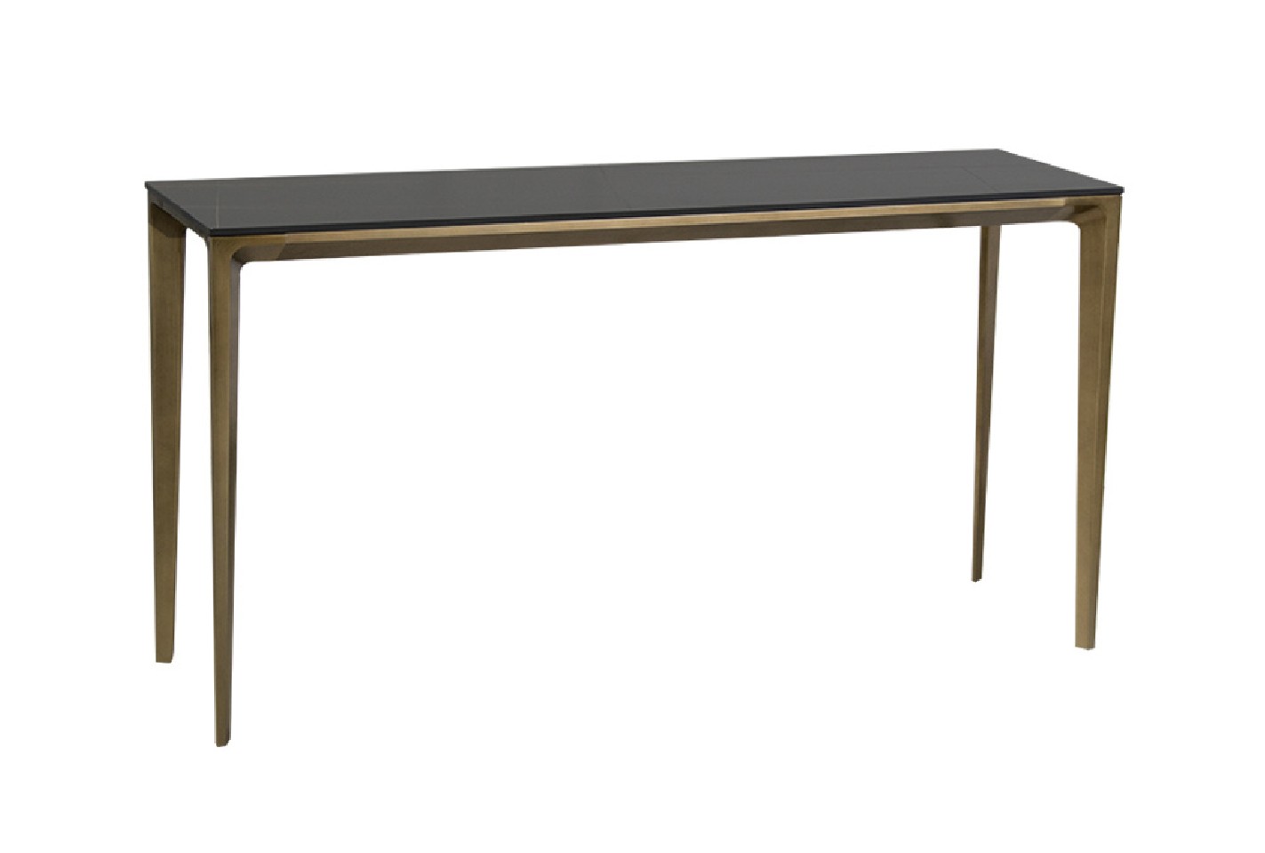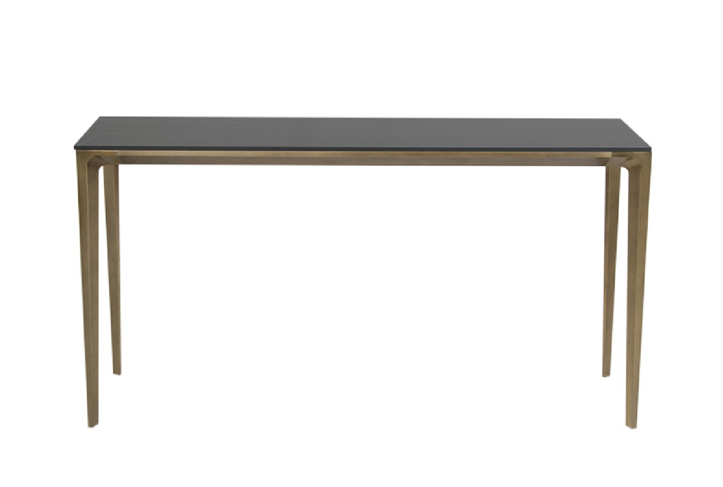 Detta minimalistiska, moderna konsolbord är utsmyckat med en toppskiva av kvartssinter som imiterar en marmor. Detta material är extremt motståndskraftigt mot stötar, nötning och repor. En solid bas i aluminium med enkel form i en nyans av rustik koppar, skapar en komplett harmoni ihop med stenskivan. Detta mångsidiga konsollbord passar perfekt som sminkbord, i vardagsrummet och hallen.