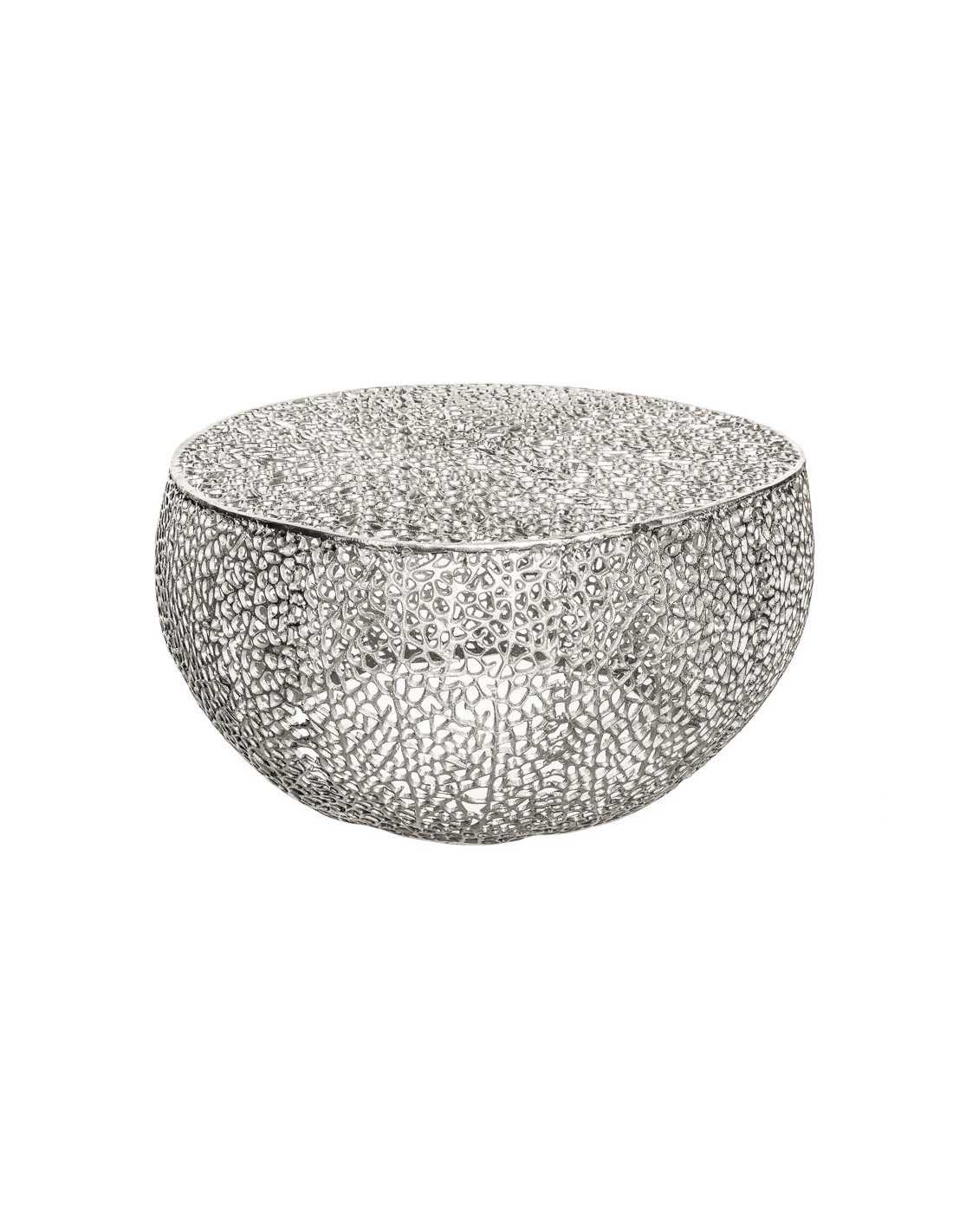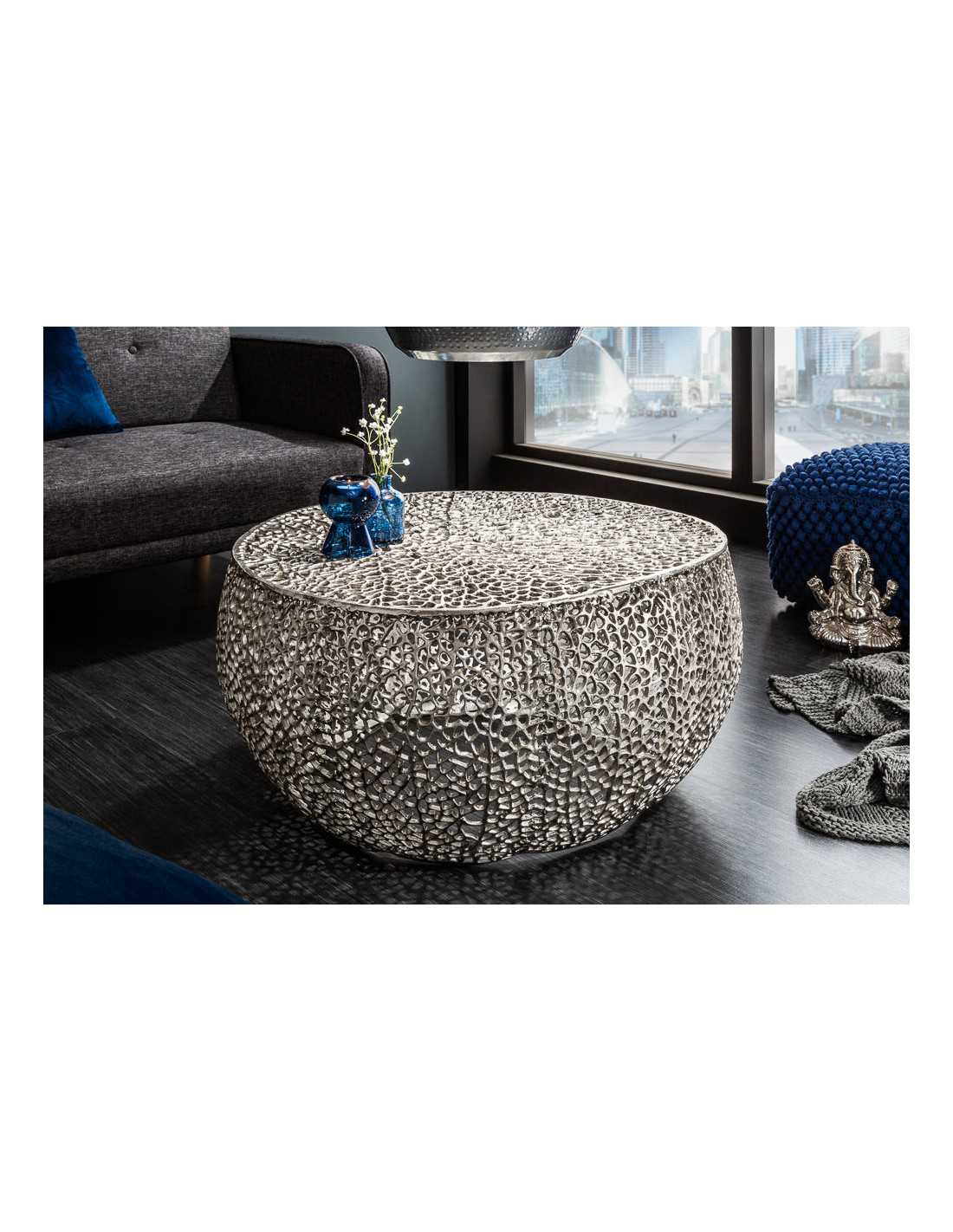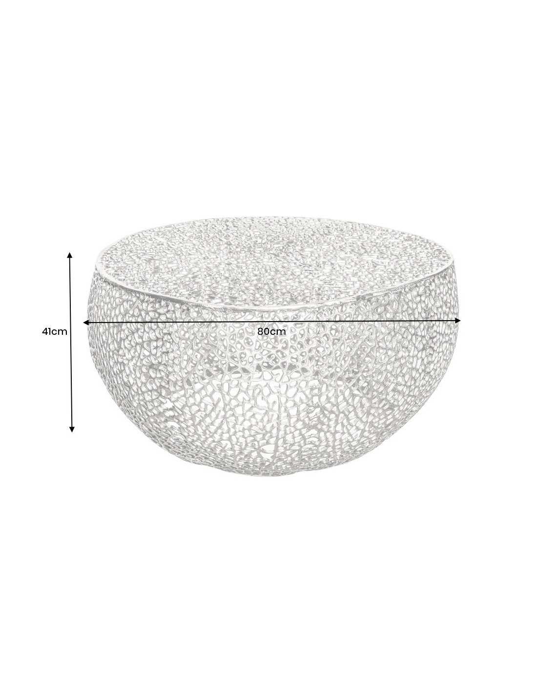Lyra soffbord i silver blir ett glimrande smycke i ditt vardagsrum. Den skulpturala bladformen och den handgjorda ytan skapar en lyxig och unik känsla som drar blickarna till sig. Detta runda soffbord i metall har en elegant silverfinish som reflekterar ljuset och ger rummet extra rymd. Den handgjorda strukturen gör varje bord unikt och ger en exklusiv känsla till din inredning. Perfekt som soffbord i ett modernt vardagsrum, tillsammans med sammetssoffa eller lädersoffa, och lika vackert som ett fristående designobjekt. Stabil konstruktion i metall-aluminiumlegering ger lång hållbarhet och lättskött yta. Mått: Bredd: 80 cm Höjd: 41 cm Djup: 80 cm
