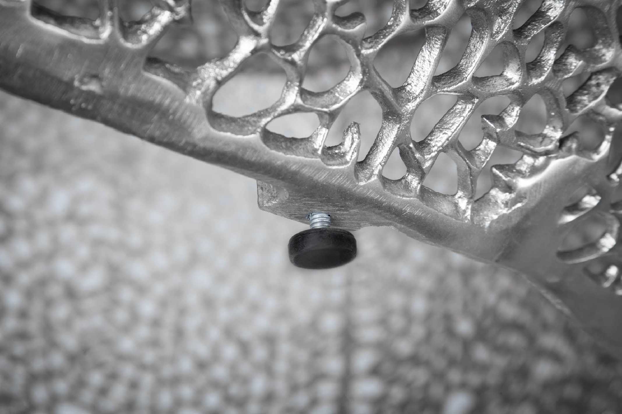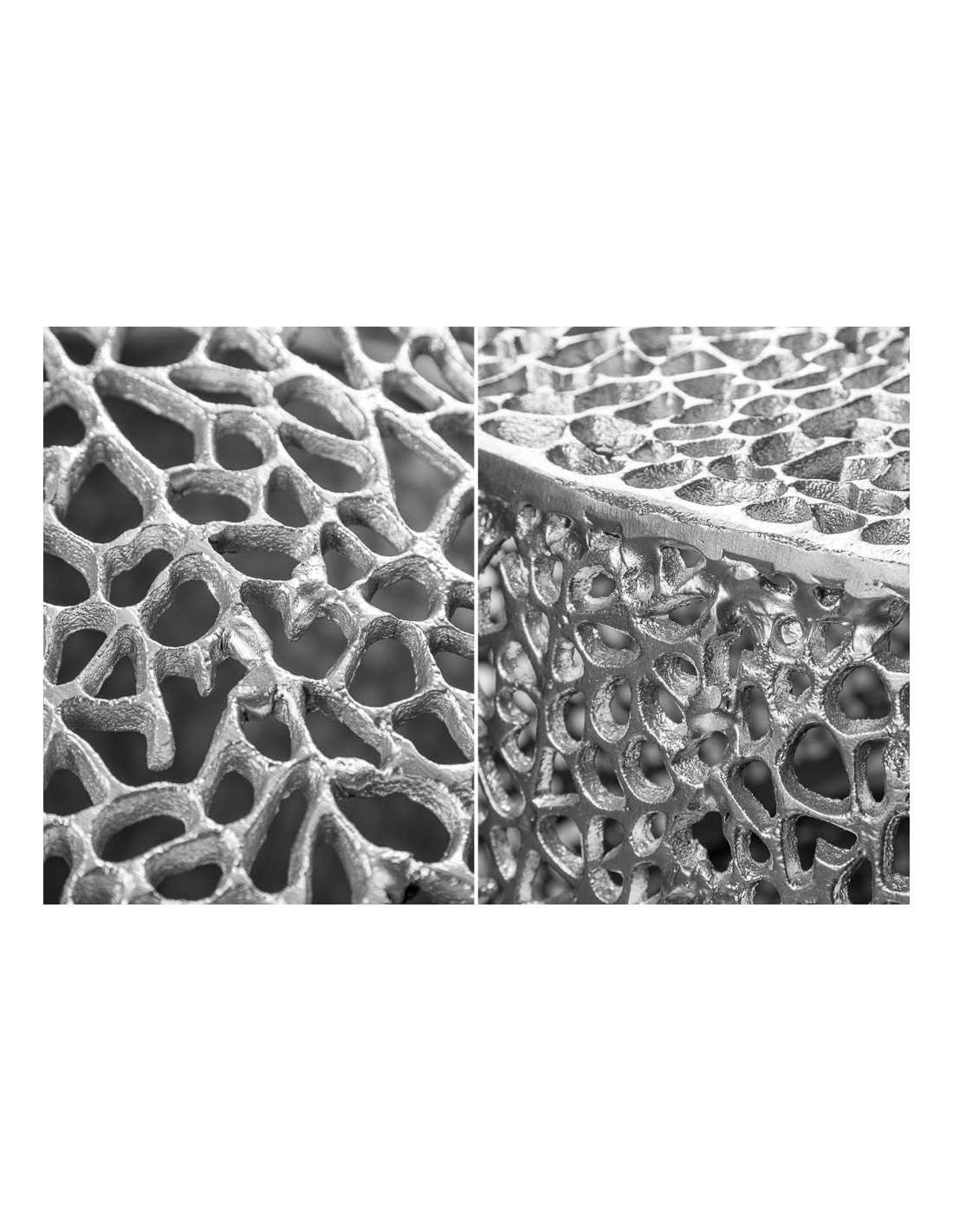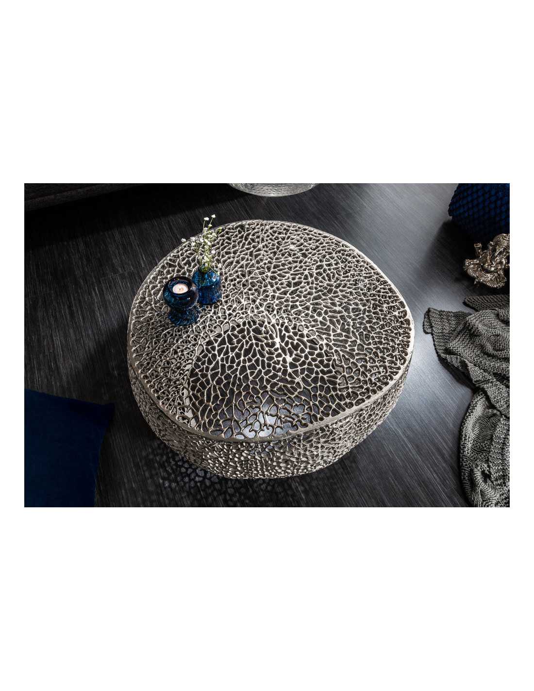 Lyra soffbord i silver blir ett glimrande smycke i ditt vardagsrum. Den skulpturala bladformen och den handgjorda ytan skapar en lyxig och unik känsla som drar blickarna till sig. Detta runda soffbord i metall har en elegant silverfinish som reflekterar ljuset och ger rummet extra rymd. Den handgjorda strukturen gör varje bord unikt och ger en exklusiv känsla till din inredning. Perfekt som soffbord i ett modernt vardagsrum, tillsammans med sammetssoffa eller lädersoffa, och lika vackert som ett fristående designobjekt. Stabil konstruktion i metall-aluminiumlegering ger lång hållbarhet och lättskött yta. Mått: Bredd: 80 cm Höjd: 41 cm Djup: 80 cm