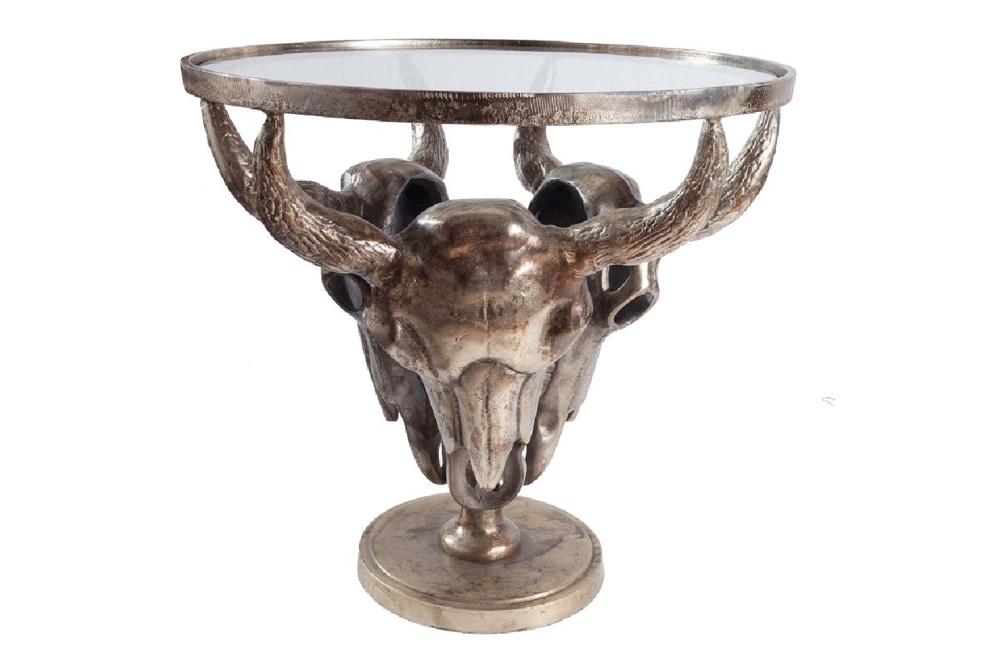 MATADOR är ett snyggt och stilrent soffbord i metall och glas. Det runda bordet har bronsfärg och har en skiva i glas. Detta soffbord är ett perfekt komplement till ditt vardagsrum! Bordsbasen utgörs av tre tjurhuvuden.