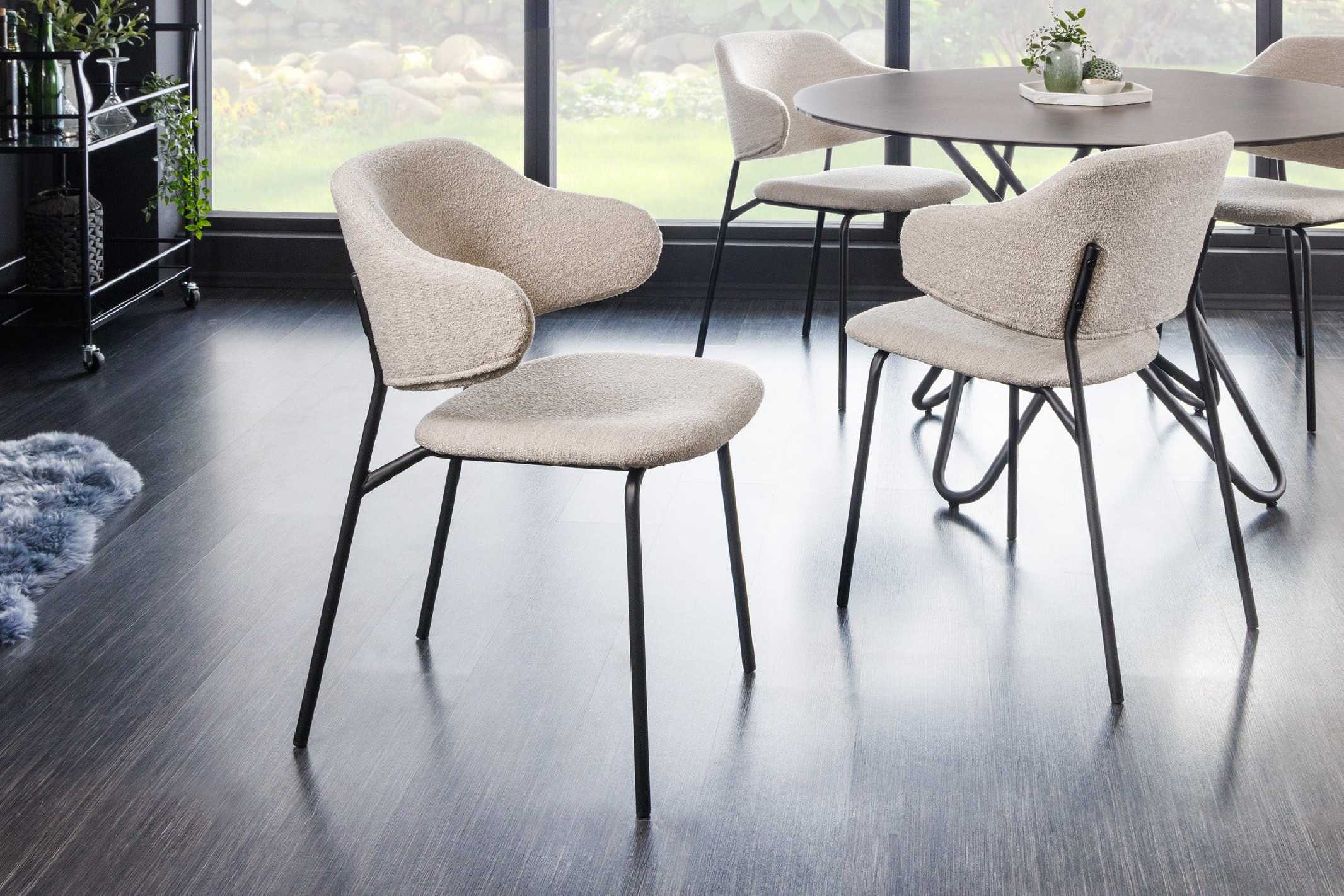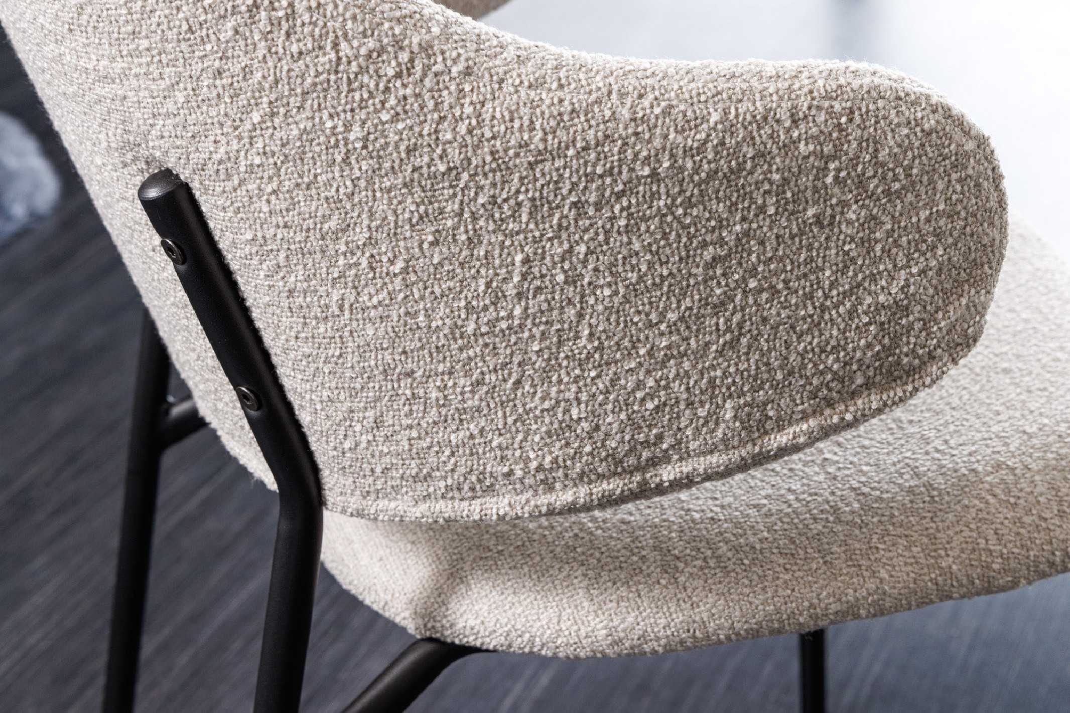 Lyra matstol omfamnar dig med mjuk bouclé i trendigt greige och ger rummet en sofistikerad, inbjudande känsla. Den nätta siluetten och de svarta benen skapar en modern kontrast som lyfter både kök och matsal. Den generösa sittkomforten i boucléstoppning gör Lyra till en stol du gärna sitter länge i, oavsett om det är till vardagsmiddag eller fest. Det slitstarka boucléstyget i 100% polyester är både stilfullt och praktiskt, perfekt för en matstol som används dagligen. Den pulverlackerade metallstommen ger stabilitet och lång hållbarhet, medan de svarta benen ger en tidlös, nordisk look. En matstol i bouclé som kombinerar design, komfort och funktion på ett elegant sätt. Mått: Bredd x Höjd x Djup 58 x 83 x 54 cm Sittdjup: ca 54 cm Sitthöjd: 49 cm Höjd armstöd: 72 cm