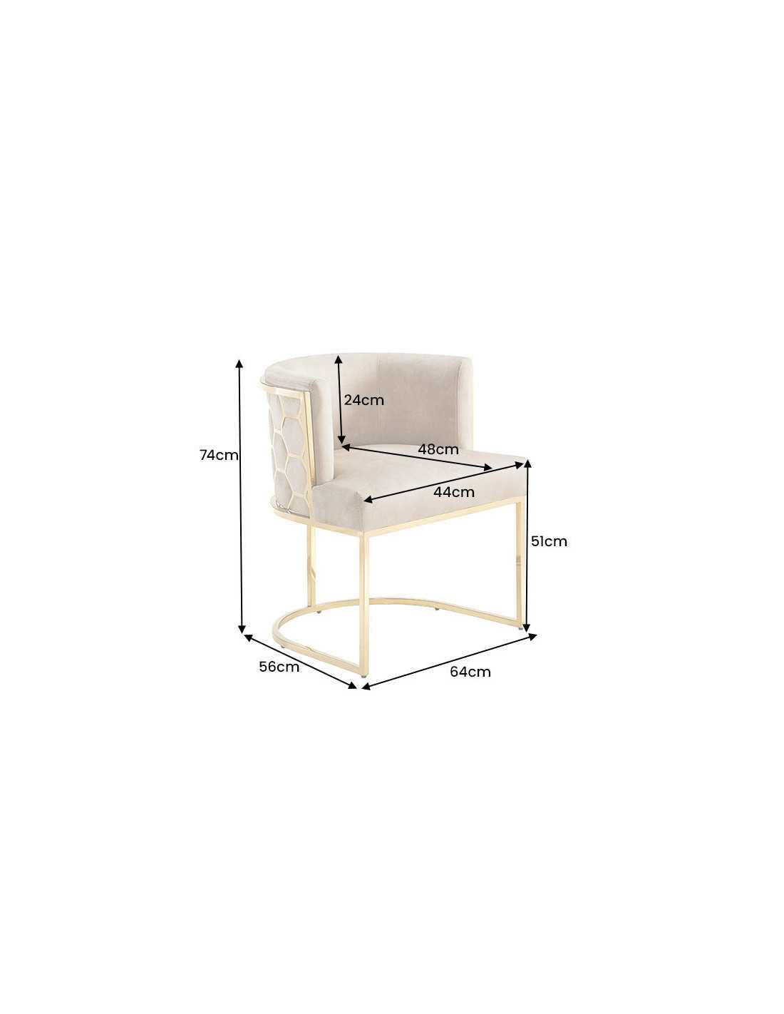VEGA fångar blicken direkt – en elegant sammetsfåtölj i mjuk beige ton med glamorösa gulddetaljer som lyfter hela rummet. Den generösa sitsen och omfamnande formen skapar en lyxig känsla som gör varje stund vid matbordet eller sminkbordet extra speciell. Klädd i len beige sammet (sammetsstol) i 100% polyester erbjuder VEGA både stil och slitstyrka i vardagen. Det guldfärgade underredet i rostfritt stål ger en stabil och hållbar konstruktion med max belastning på 110 kg, samtidigt som det tillför en modern, lyxig karaktär. Kombinationen av mjuk stoppning, rundad rygg och exklusiv finish gör denna sammetsfåtölj lika bekväm som den är dekorativ – perfekt som matsalsstol, sminkbordstol eller accentfåtölj i vardagsrum och sovrum. Mått: Bredd x Höjd x Djup 64 x 74 x 56 cm Sitt höjd: 51 cm Sittmått: 44 x 48 cm