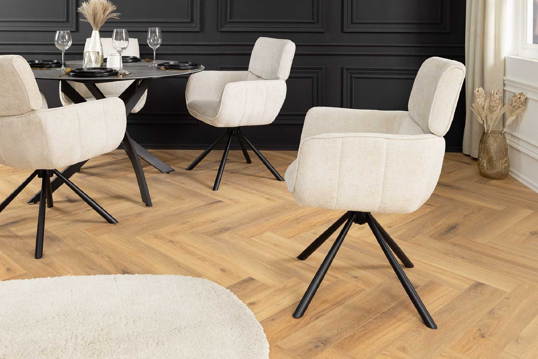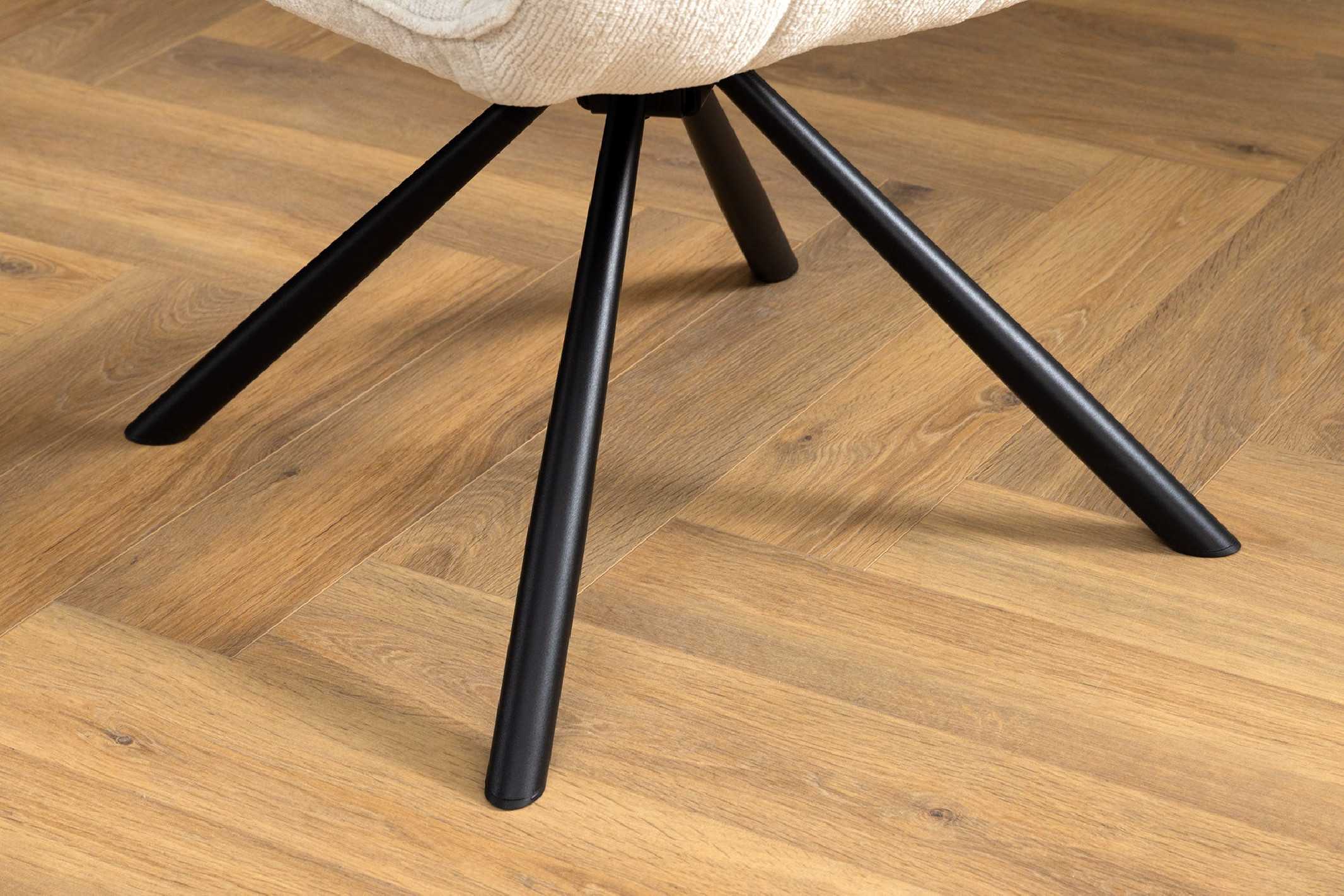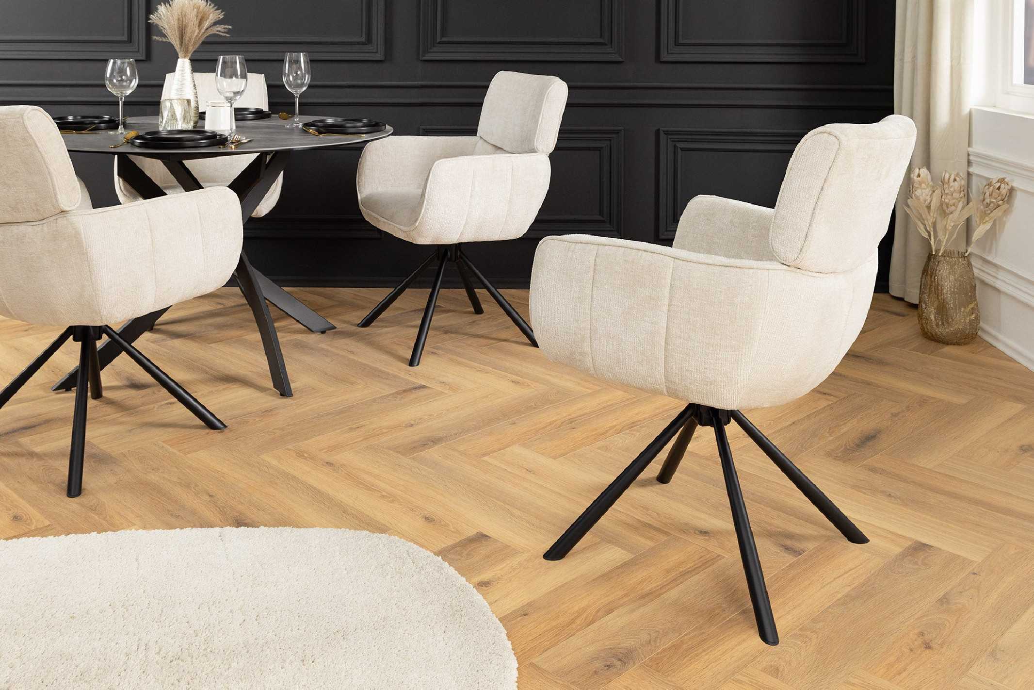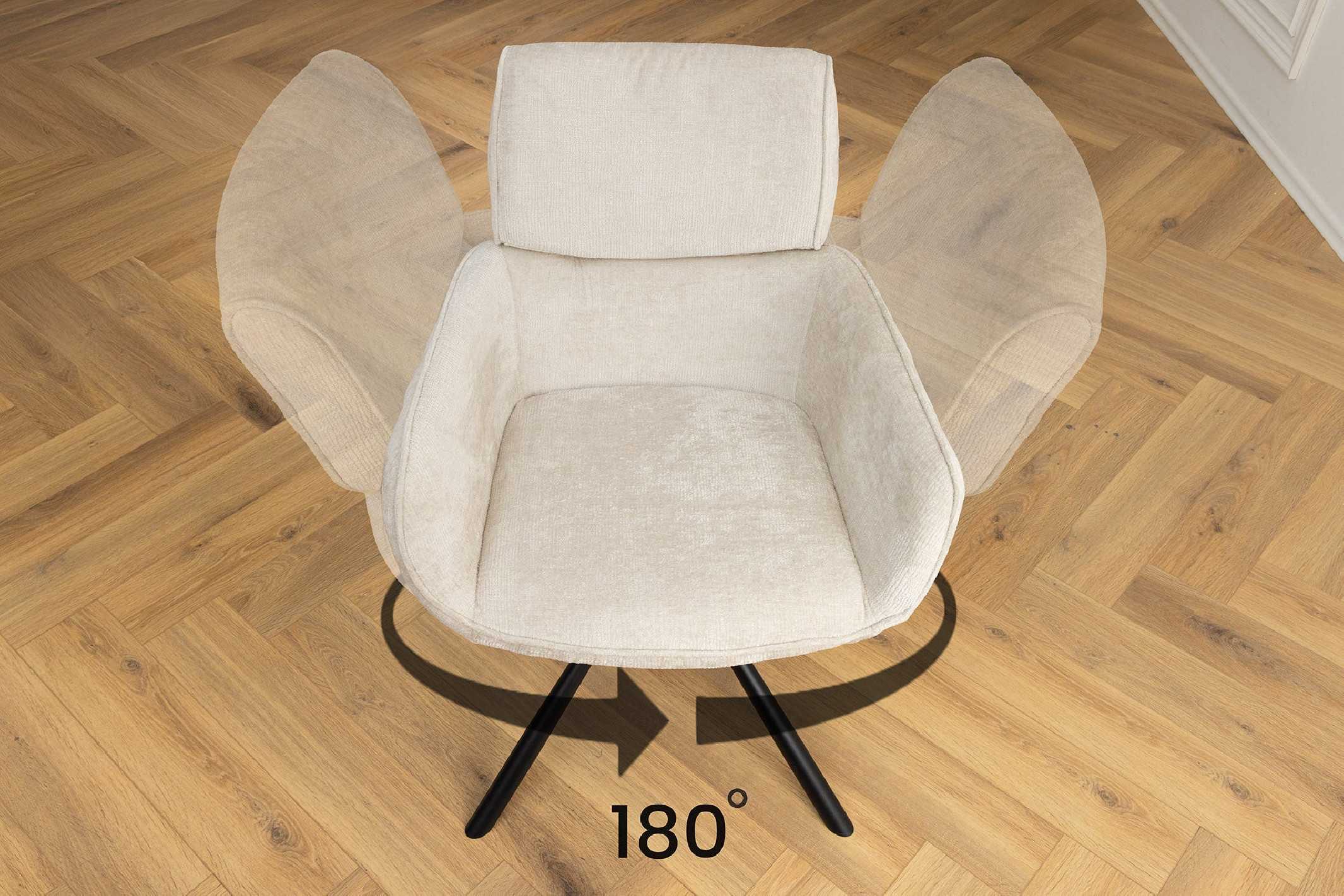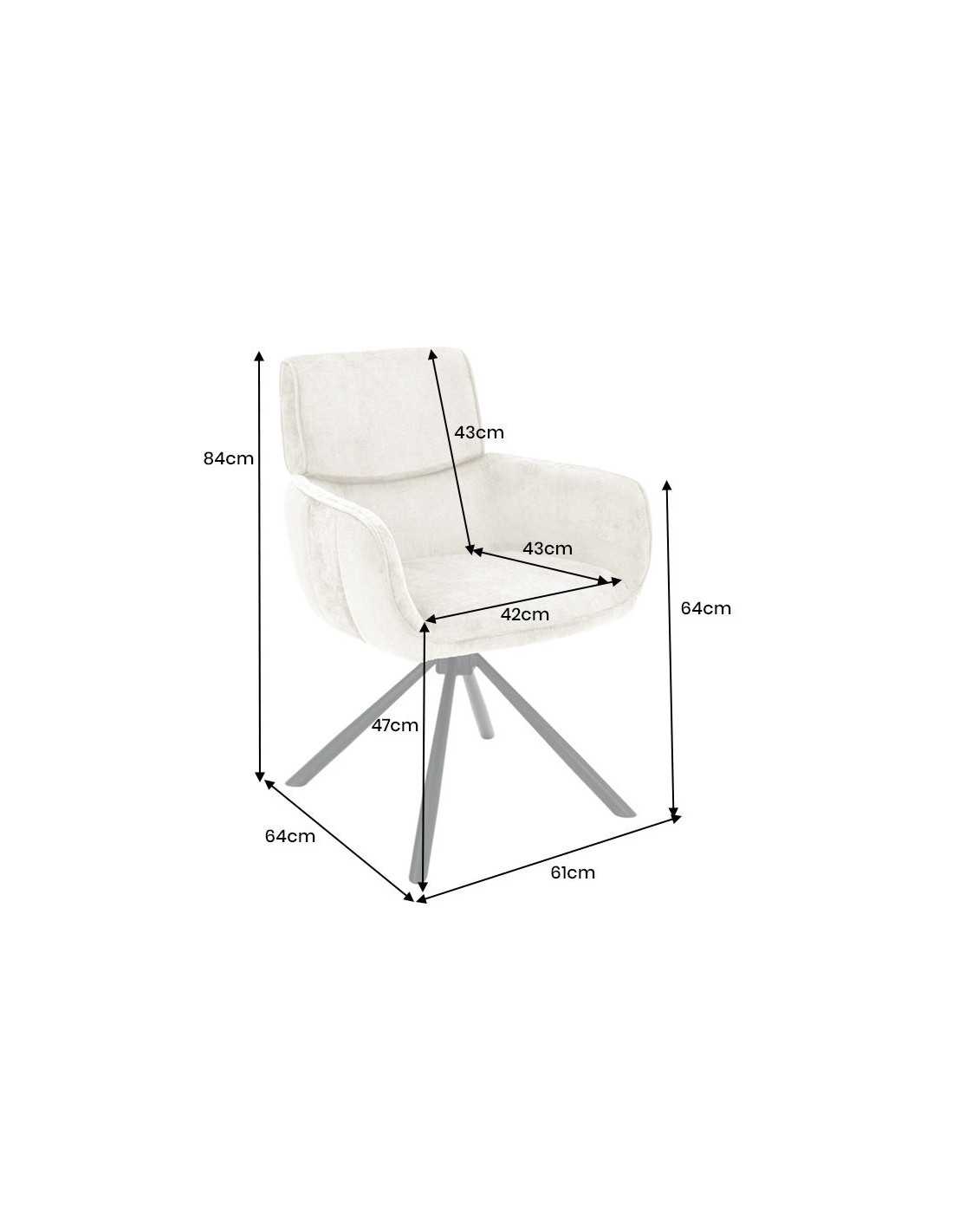 NOVA snurrstol förvandlar ditt rum med sin moderna siluett och inbjudande komfort. Den mjukt skiftande champagnebeige tonen ger en varm, elegant känsla som passar lika bra vid matbordet som i hemmakontoret. Den tåliga chenilleklädseln i 100% polyester är len mot huden men gjord för vardaglig användning, vilket gör NOVA till en perfekt snurrstol för både matplats och arbetsplats. De svarta benen skapar en stilren kontrast mot det ljusa tyget och ger stolen ett tidlöst, nordiskt uttryck. Den 180° svängfunktionen ger enkel rörelsefrihet runt bordet, medan de integrerade armstöden och den välformade ryggstödet ger bekväm sittkomfort under långa middagar eller arbetsdagar. Detta är en champagnebeige snurrstol med armstöd som kombinerar design och funktion på hög nivå. Mått: Bredd x Höjd x Djup Stol: 61 x 84 x 64 cm Sitthöjd: 47 cm Sittyta: 42 x 43 cm Ryggstödets höjd: 43 cm Armstödets höjd: 18 cm Avstånd golv till armstöd: 64 cm Max. belastning: 120 kg