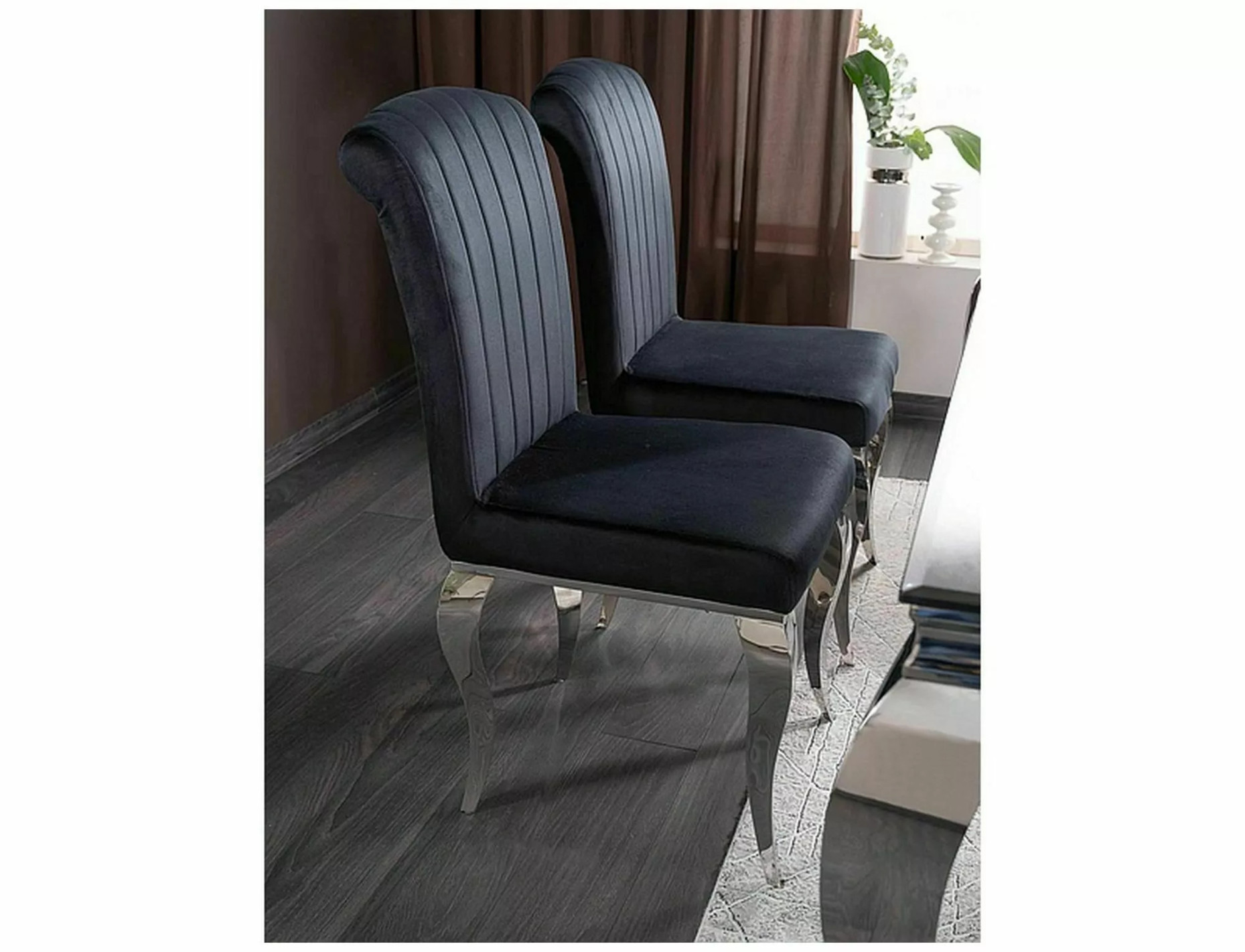 Stommen är tillverkad av slitstark metall i kromutförande som ger både stabilitet och en lyxig glans. Sits och rygg är klädda i mjuk sammetsliknande textil som känns behaglig att sitta på och ger en exklusiv känsla. Stolen är designad för vardagligt bruk med en maximal belastning på 120 kg, vilket gör den både praktisk och hållbar.
