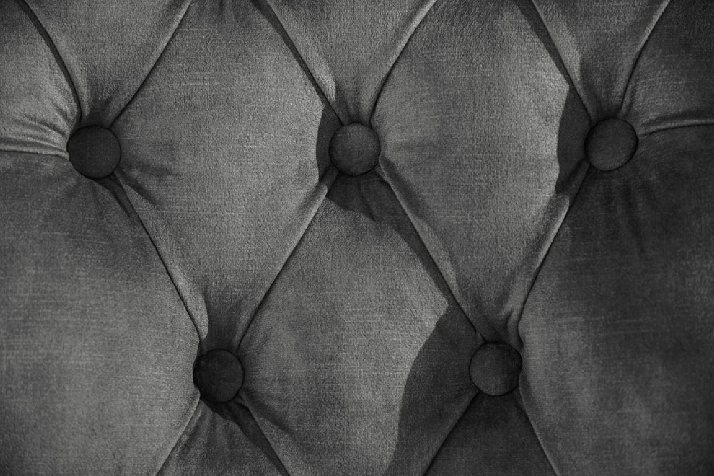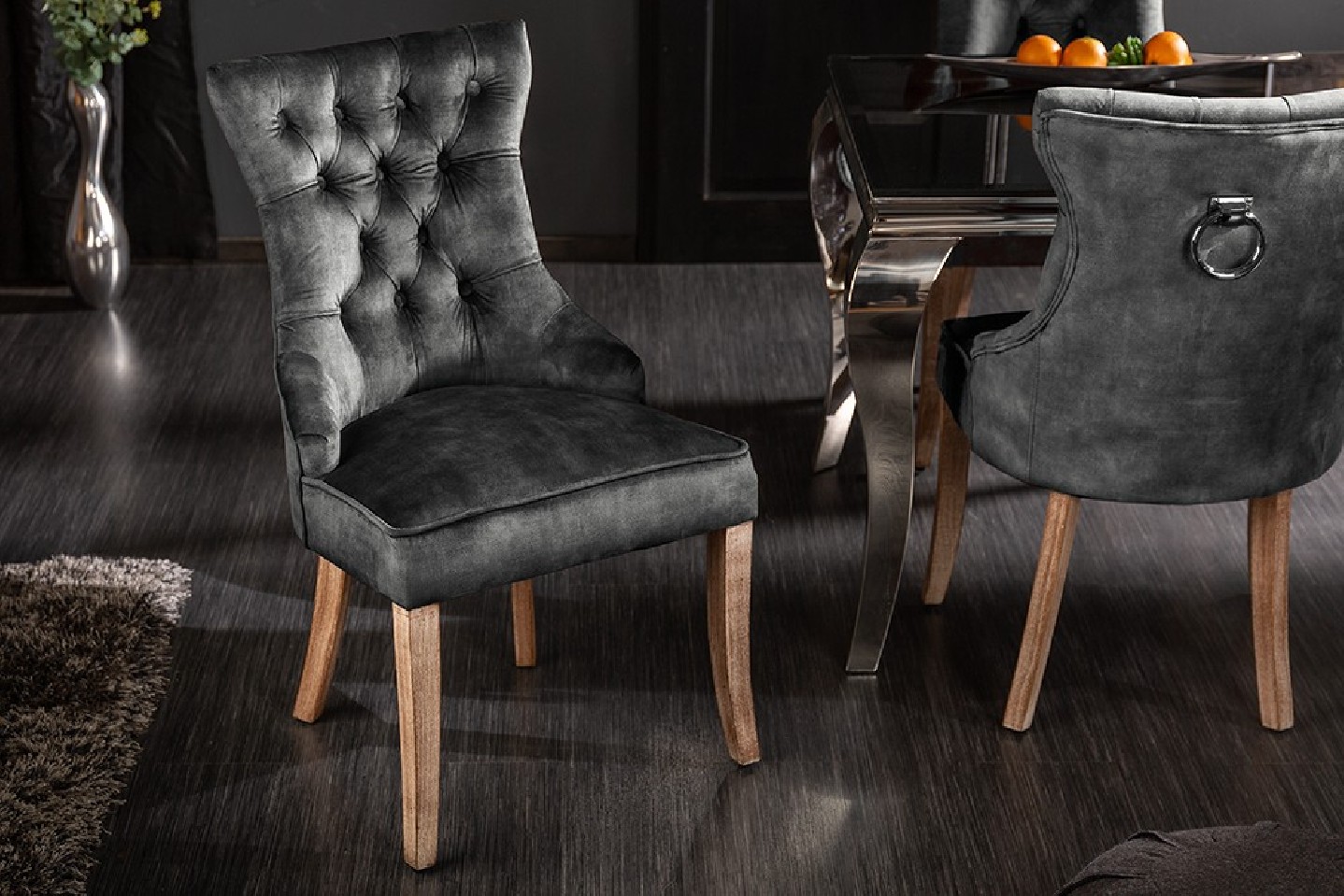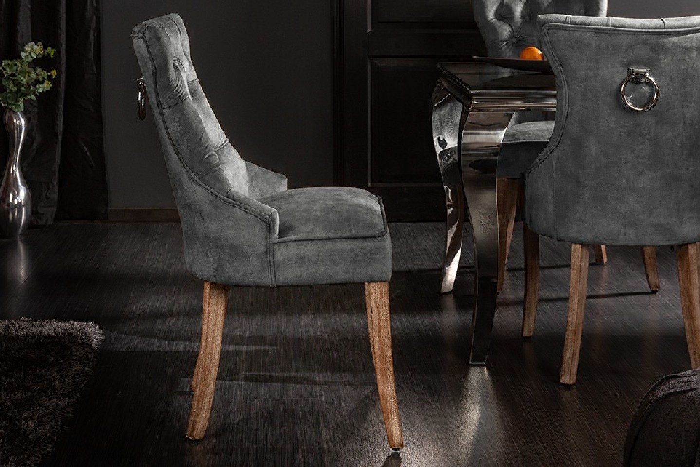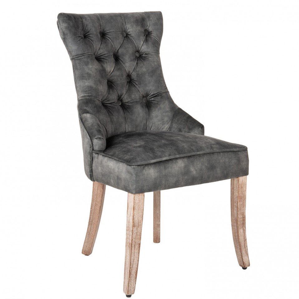 Snygg slottsstol med dekorativa knappar gjord av grå/grön sammet. Med praktiskt komforthandtag på baksidan av ryggstödet.