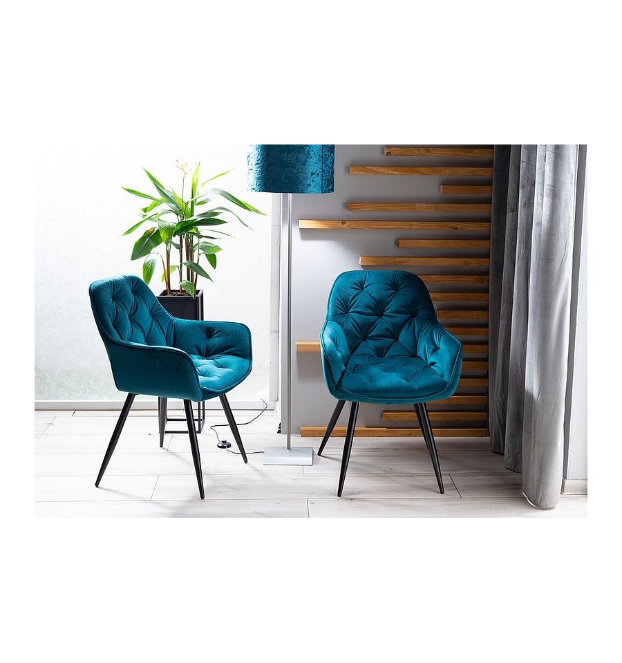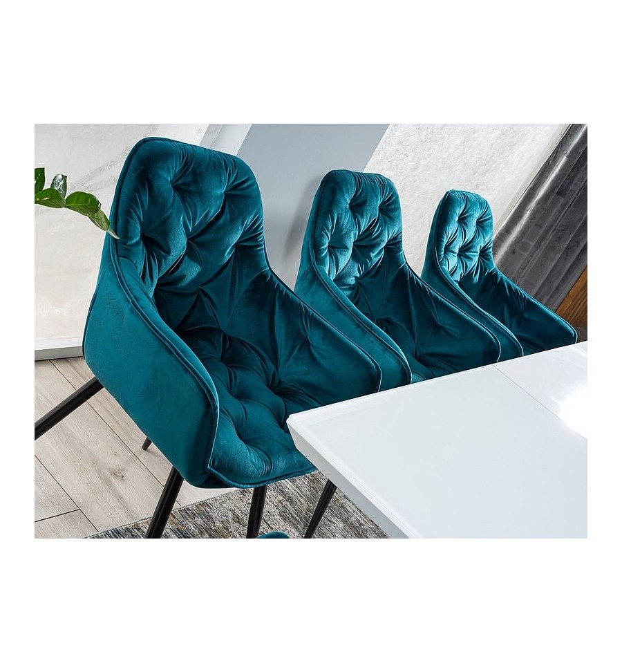 Bekväm och stilig stol i turkos sammet med ryggstöd. Den blir perfekt till matsalsbordet.