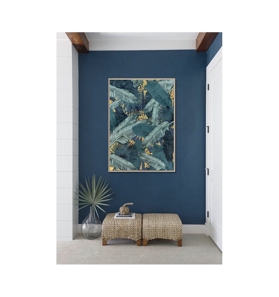 Turkos målning med abstrakt motiv av blad med detaljer i guld, omgiven av en amerikansk lådram. Rammodellen kännetecknas av ett litet avstånd mellan bild och ram.