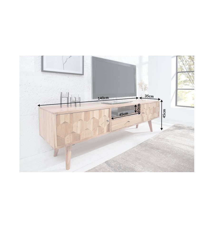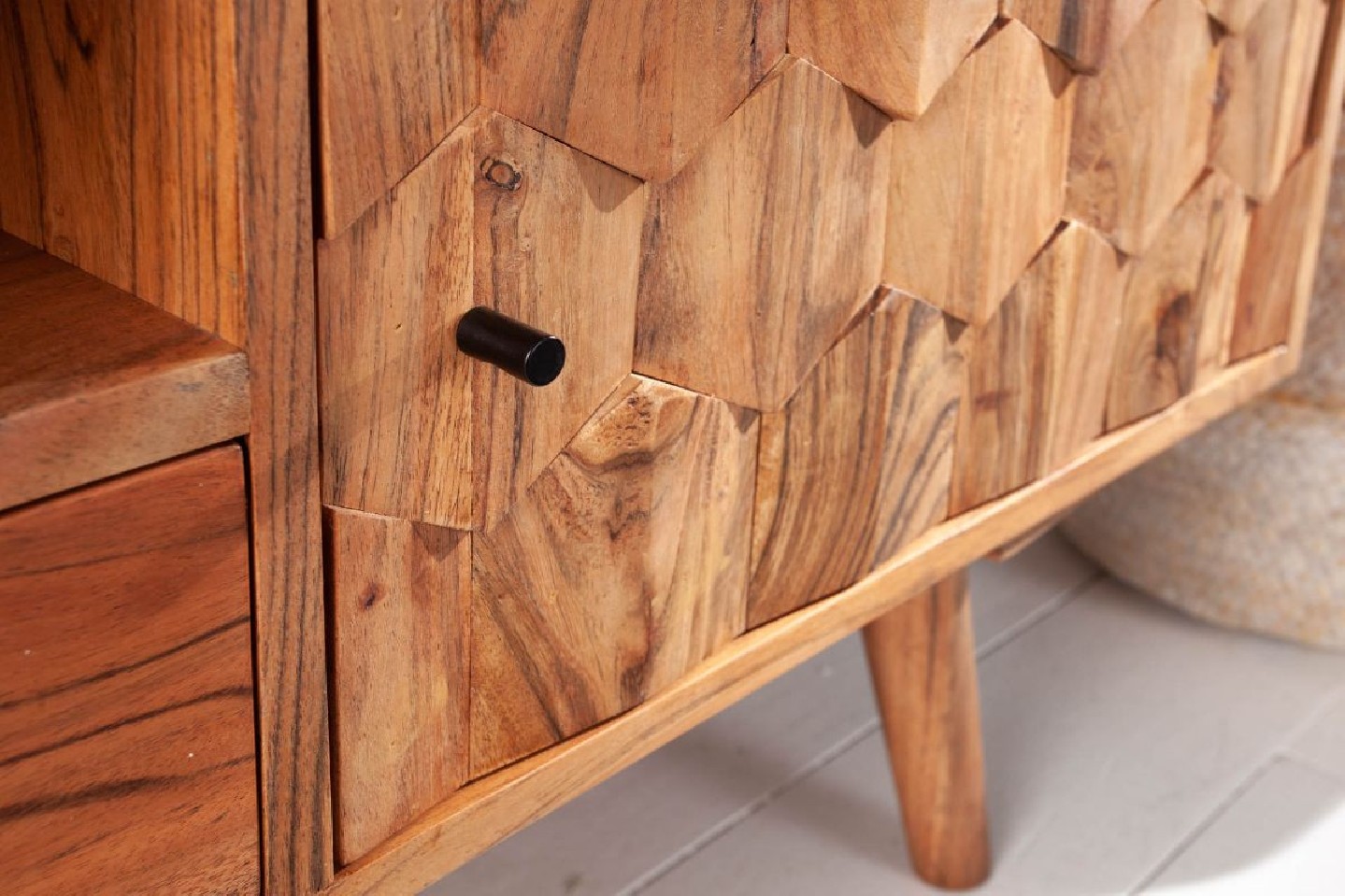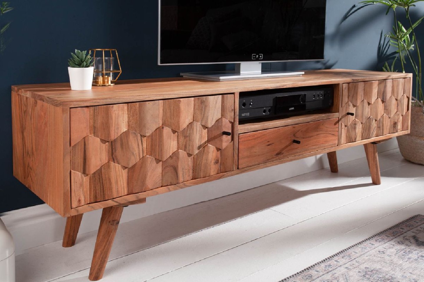 OMLOTT är en tv-bänk i en snygg design med praktiska förvaringsmöjligheter. Tillverkad i högkvalitativt massivt akaciaträ med två stora skåp, en låda och en hylla som ger dig mycket förvaringsmöjligheter. Alla möbler från OMLOTT-serien är unikt handgjorda!