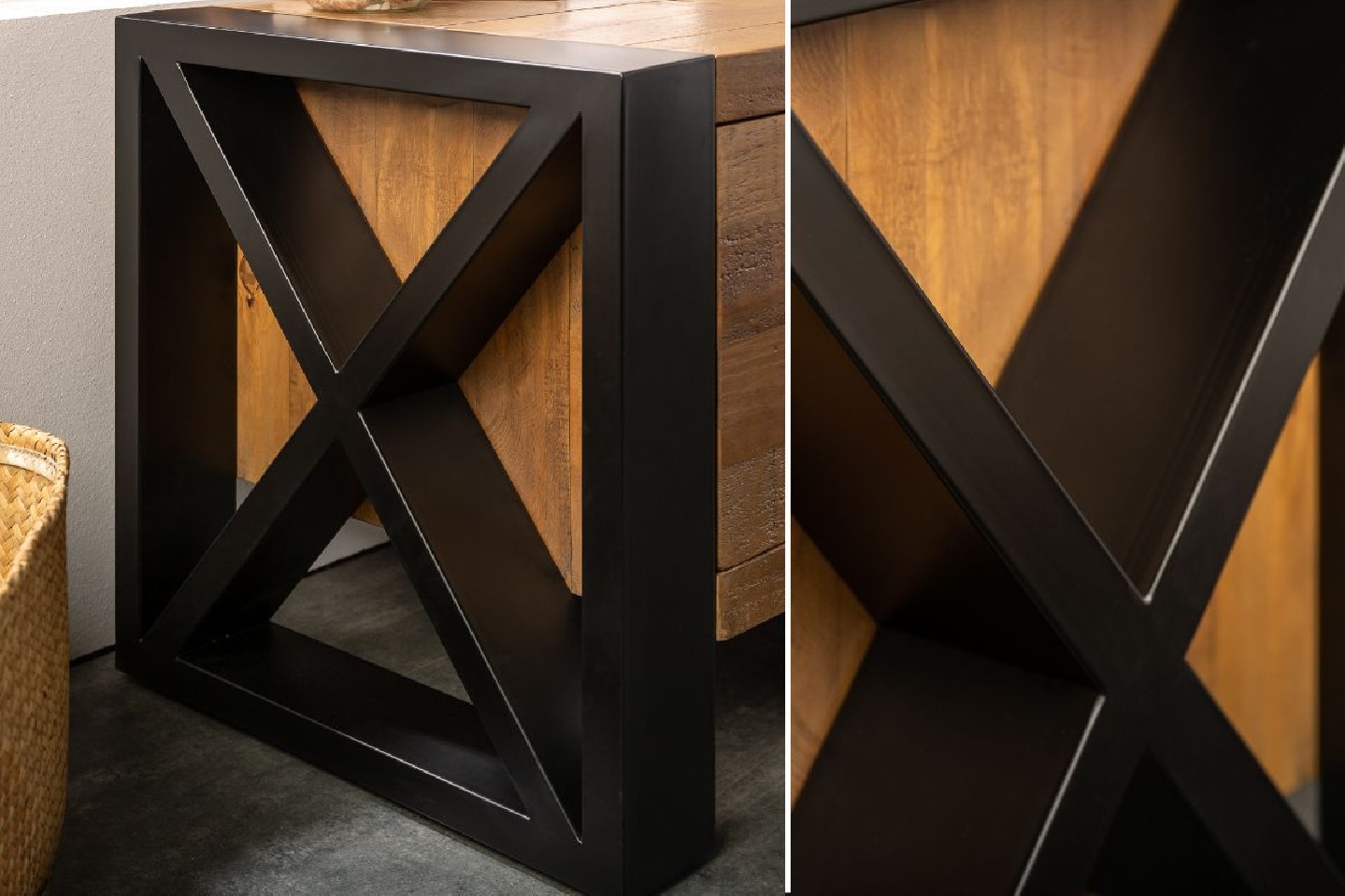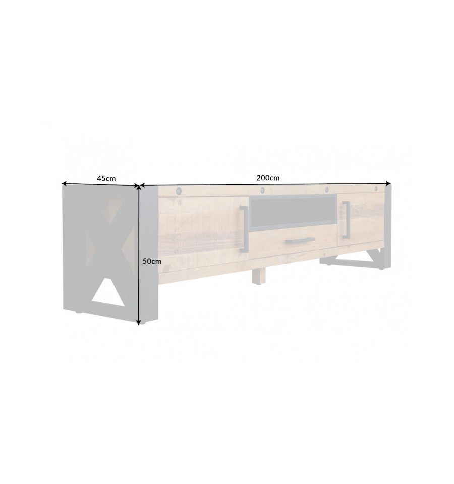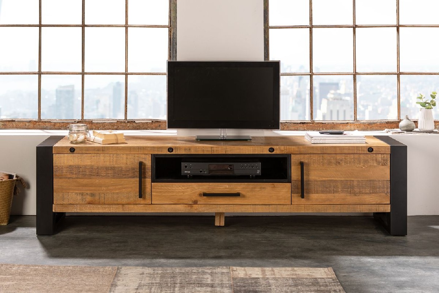Vacker TV-bänk i furu. De svarta järnramarna skapar ett industriellt utseende.